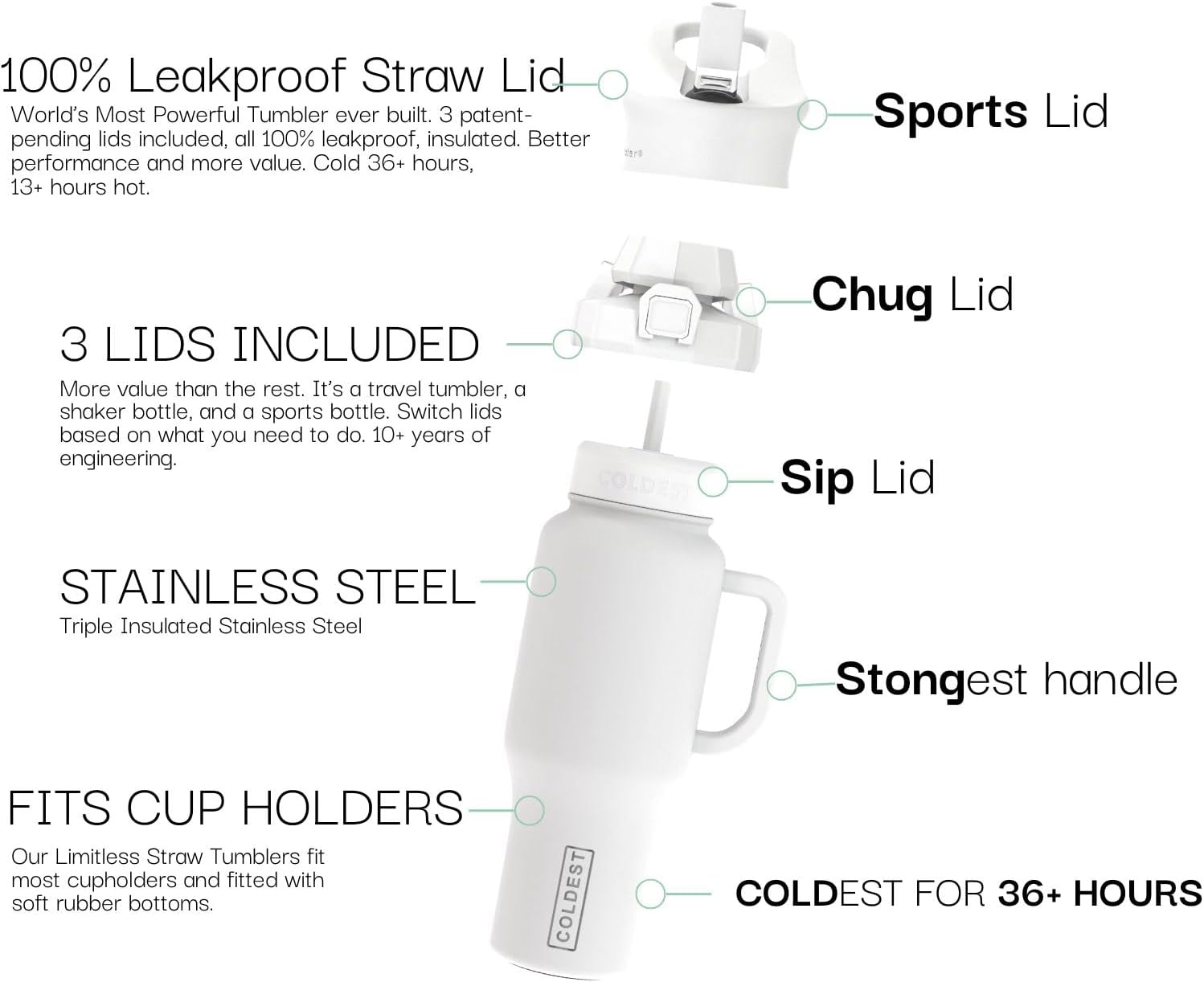 Coldest 40 oz Tumbler with Handle and Straw - 100% Leak Proof Insulated Tumbler with Lid and Straw (3 Lids) - Stainless Steel Tumblers for Women & Men - Cup Holder Friendly Base, 46 oz (Epic White)