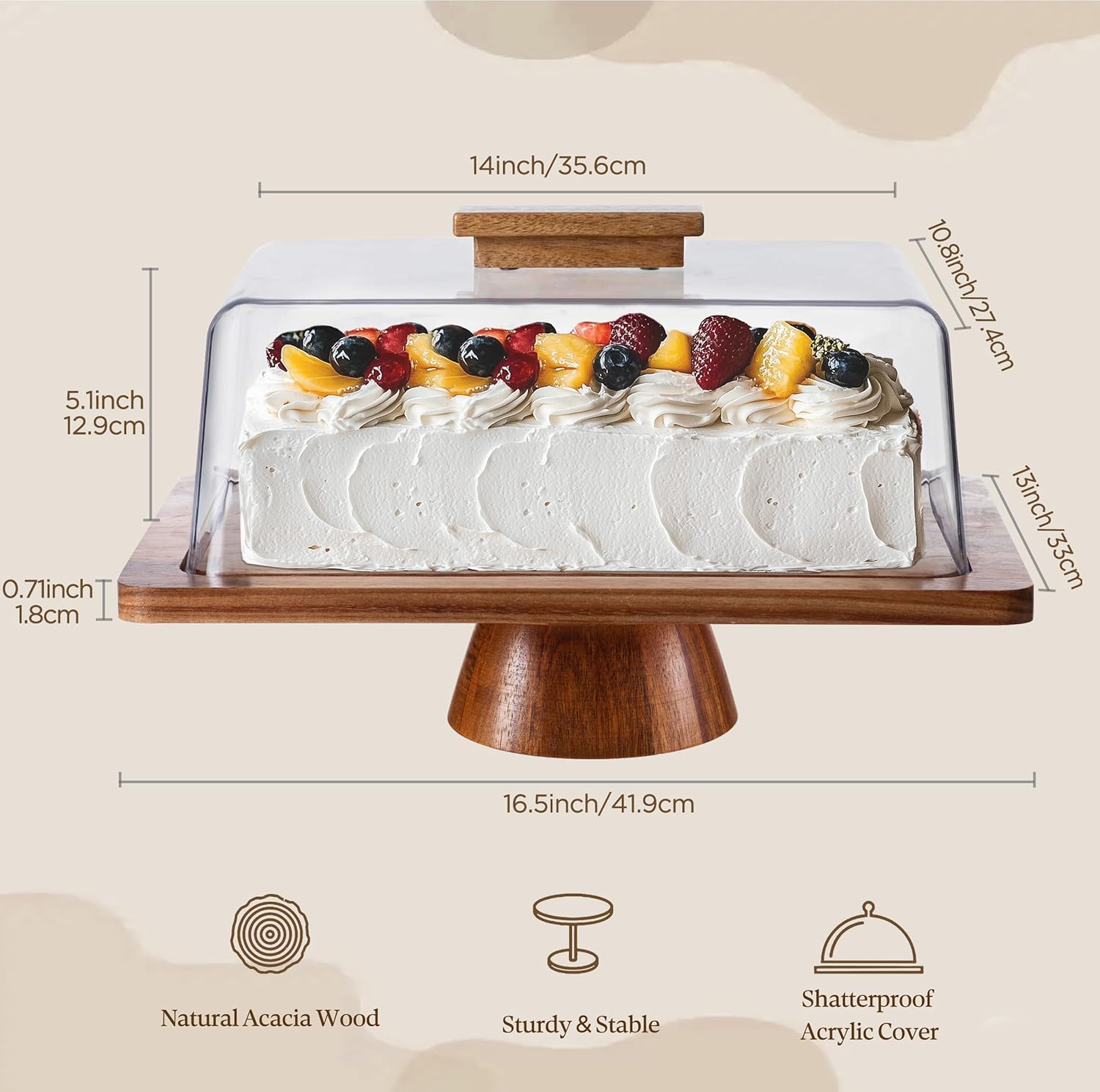 HBlife Cake Stand with Lid (16.5"), Multifunctional Cake Stand with Acrylic Dome Rectangular Acacia Wood 2-in-1 Cake Plate Display Stand with Cover for Baking Gifts, Birthday Kitchen Parties, Weddings