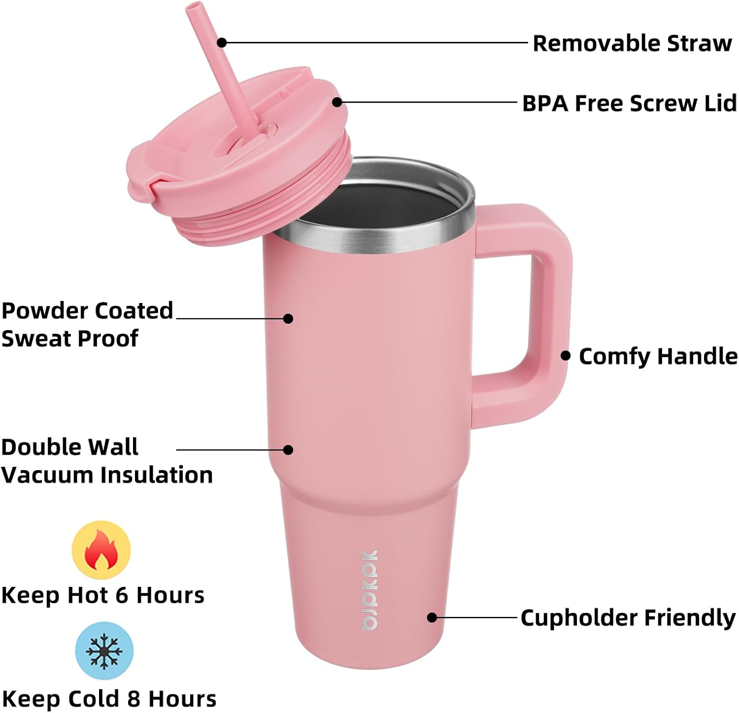 - Cupholder Friendly Travel Mugs With Handle: The Insulated Cups Has a Narrow Bottom And A Wide Mouth Fits Most Cup Holder In Car, With A Comfortable Ergonomic Silicone Handle And Two Reusable Straw To Use More Portable, You Can Stay Sipping From Your Essential Hydration Companion, Even On Your Busiest Days