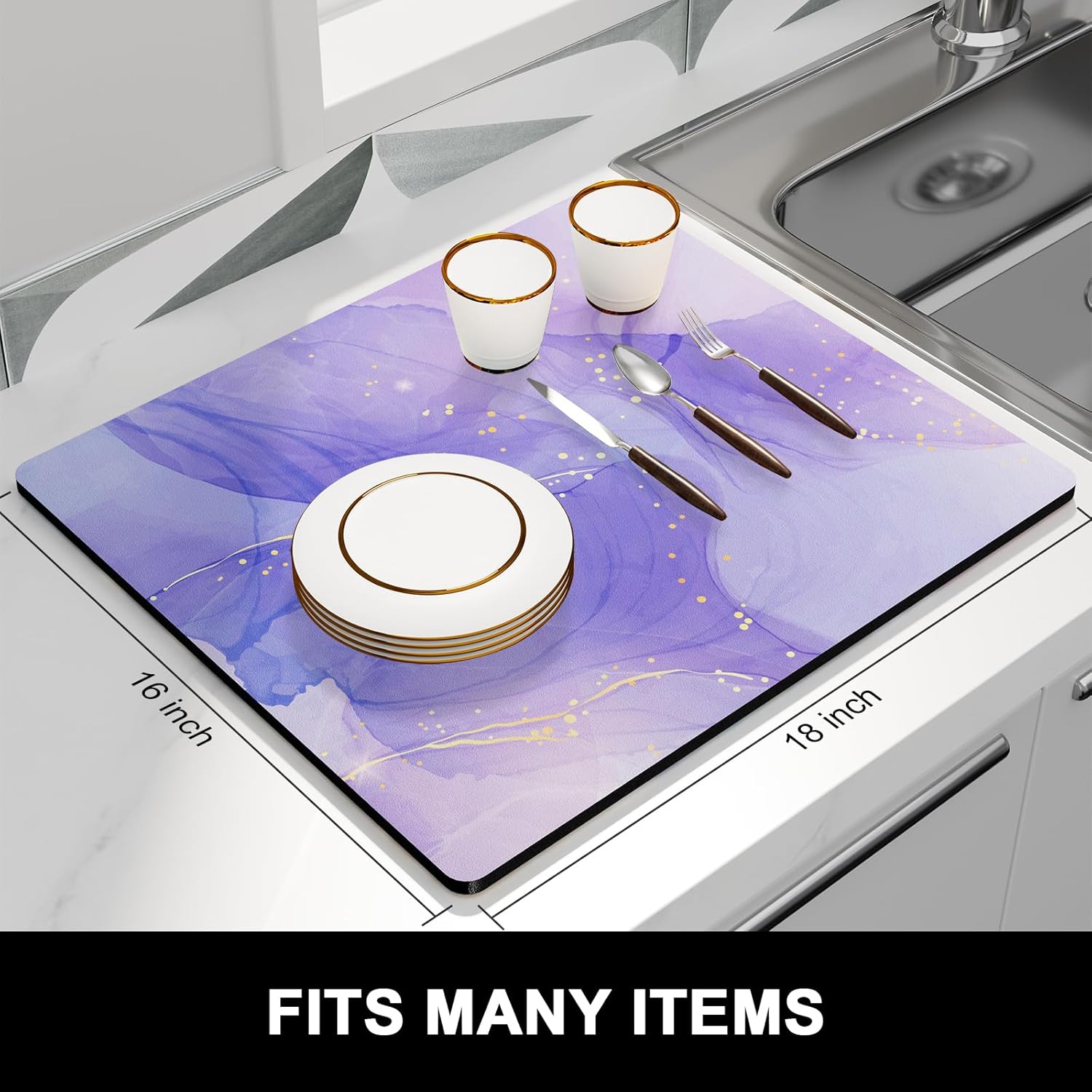 Rnivvi Dish Drying Mat for Kitchen Counter, 16 x 18" Cute Marble Theme Absorbent Heat Resistant Drying Pad with Non-slip Rubber, Coffee Bar Mats for Coffee Machine Dish Rack Kitchen Decor, Purple