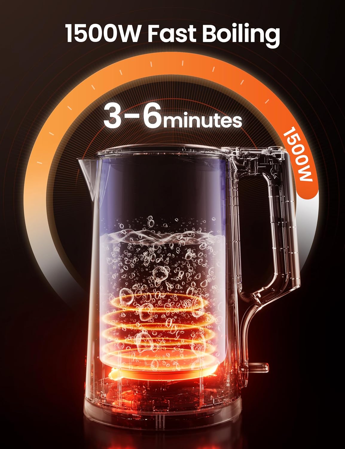 - 1500W Rapid Boil - This black electric kettle can boil 1.7 liters of water in approximately 3 to 6 minutes. This small electric kettle teapot comes with a red LED light to let you know when the water is boiling so you can prepare hot tea, coffee, hot cereal, or instant soup.