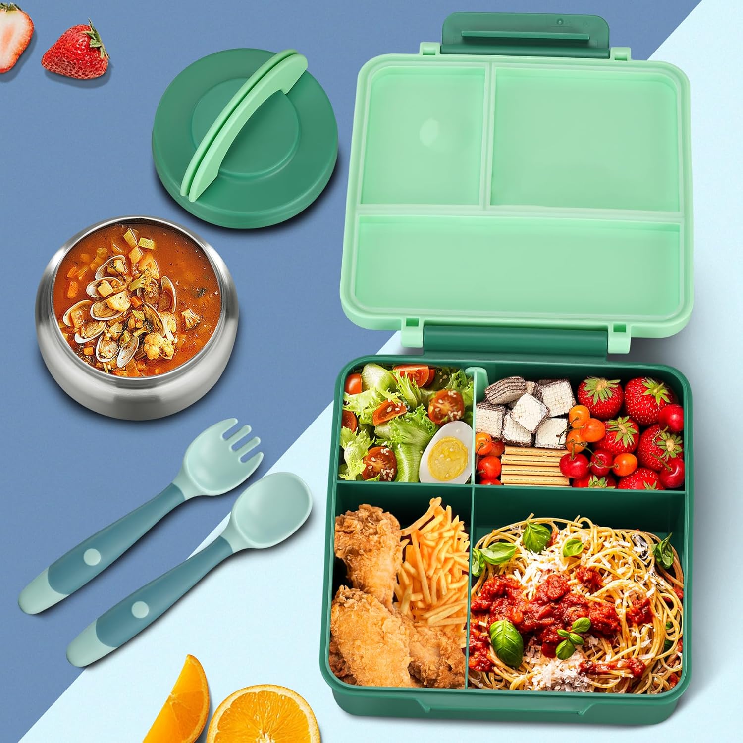 Bento Lunch Box for Kids with 8oz Soup Thermo&Lunch Bag, Leak-Proof Lunch Food Containers with 4 Compartment, Hot Food Insulated Food Jar for Kids School (Green)