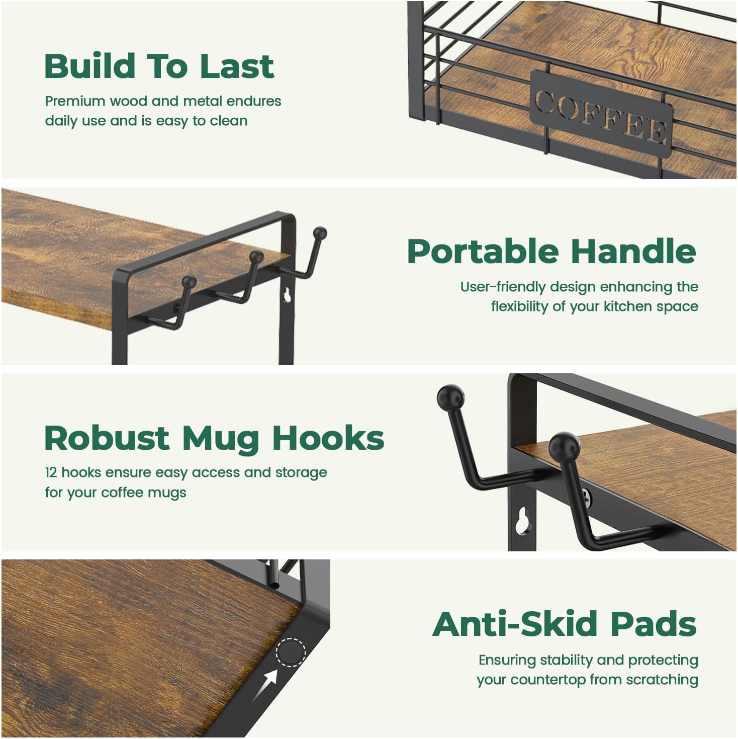 - Spacious Dual-Tier Storage: Transform your home coffee station with EsLuker.ly’s 2 tier coffee bar organizer with mug hooks, featuring two-tier shelves and 12 mug hooks. This design provides ample space for all your coffee essentials, meeting the storage needs of any family kitchen or office coffee station