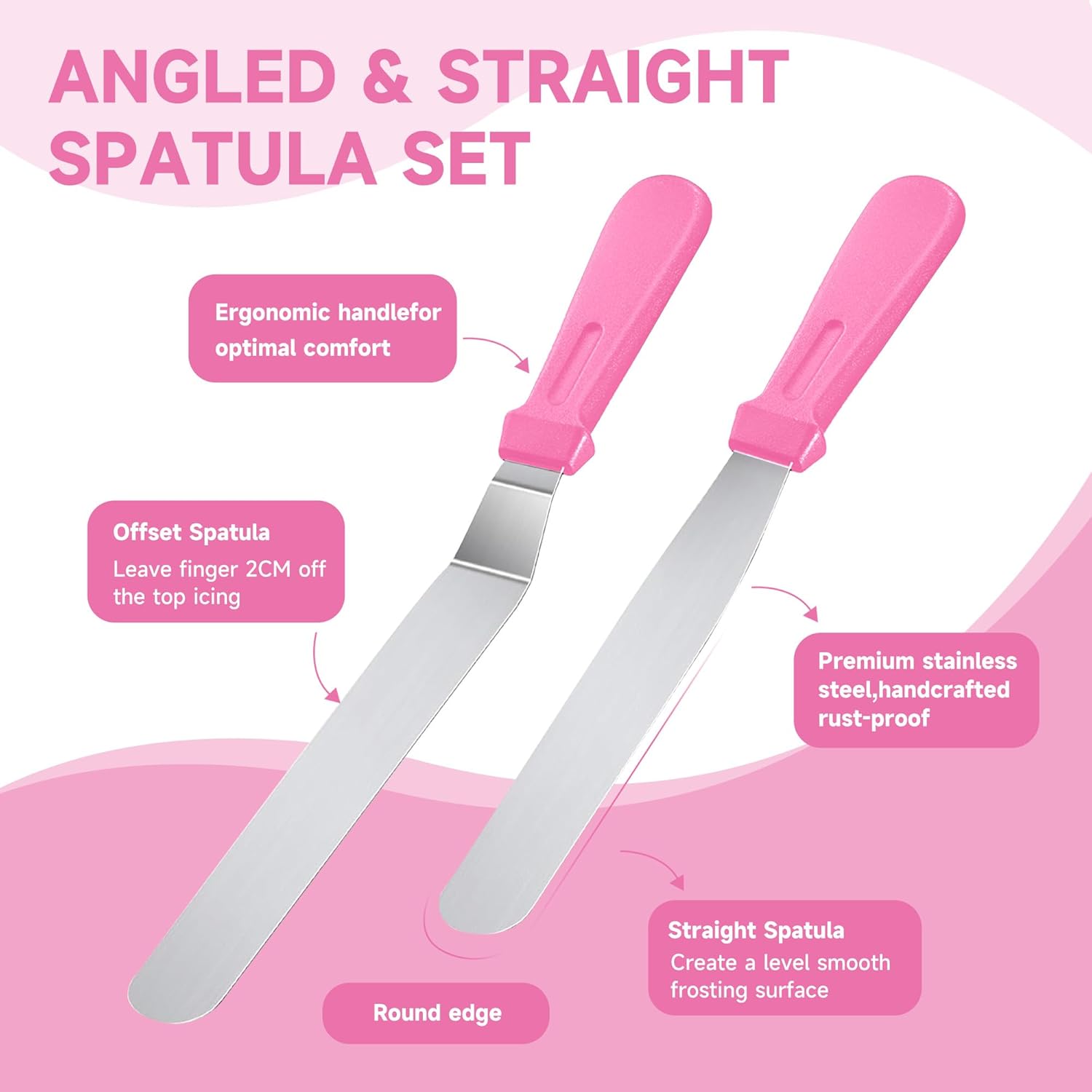 - CAKE DECORATING TOOLS :Our cake set includes scrapers, nozzles, a syringe & cake cutter, flower nails, flower lifter, straight brush, disposable bags & many more Must-Have items you'll love learning to perfect & master. Share the frosting flower fun with friends & family
