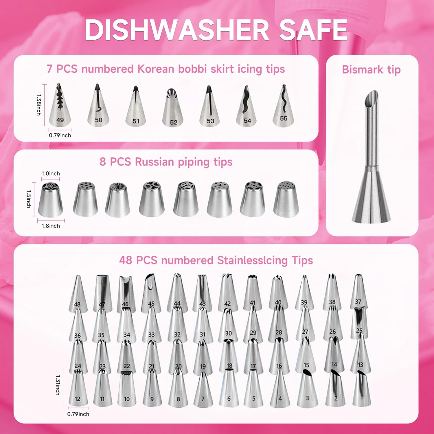- CAKE DECORATING ACCESSORIES :Whether it is lettering or frosting swirls when you are decorating cupcakes, pies, desserts & pastries; these fondant tools lets you decorate your tasty treats with ease,NUMBERED TIPS: We have selected top 63 tips including Round Tips, Leaf Tips, Petal Tips, French Tips, Basket Weave tips, open Star Tips close Star Tips, Drop Flower tips, use carefully selected stainless steel of 304 grade, Stainless steel tips with a handy re-usable storage case