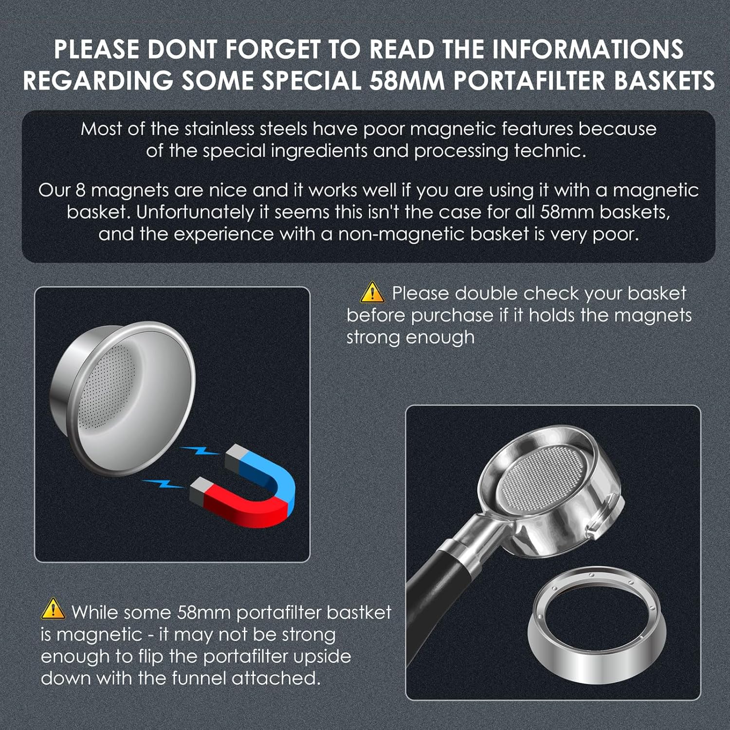 - NOTE: Most of the stainless steels have poor magnetic features because of the special ingredients. Our 58mm dosing funnel 8 magnets are nice and it works well if you are using it with a magnetic basket. Unfortunately it seems this isn't the case for all 58mm baskets, and the experience with a non-magnetic basket is very poor.