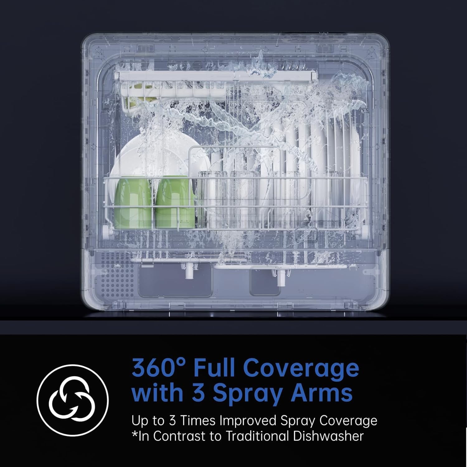 - Sleek Design & High Capacity: A01 countertop dishwasher features a slim profile, saving valuable countertop space. Ideal for small kitchens and families (5-6 people), it can accommodate plates up to 11.8 inches in diameter when the upper basket is removed.
