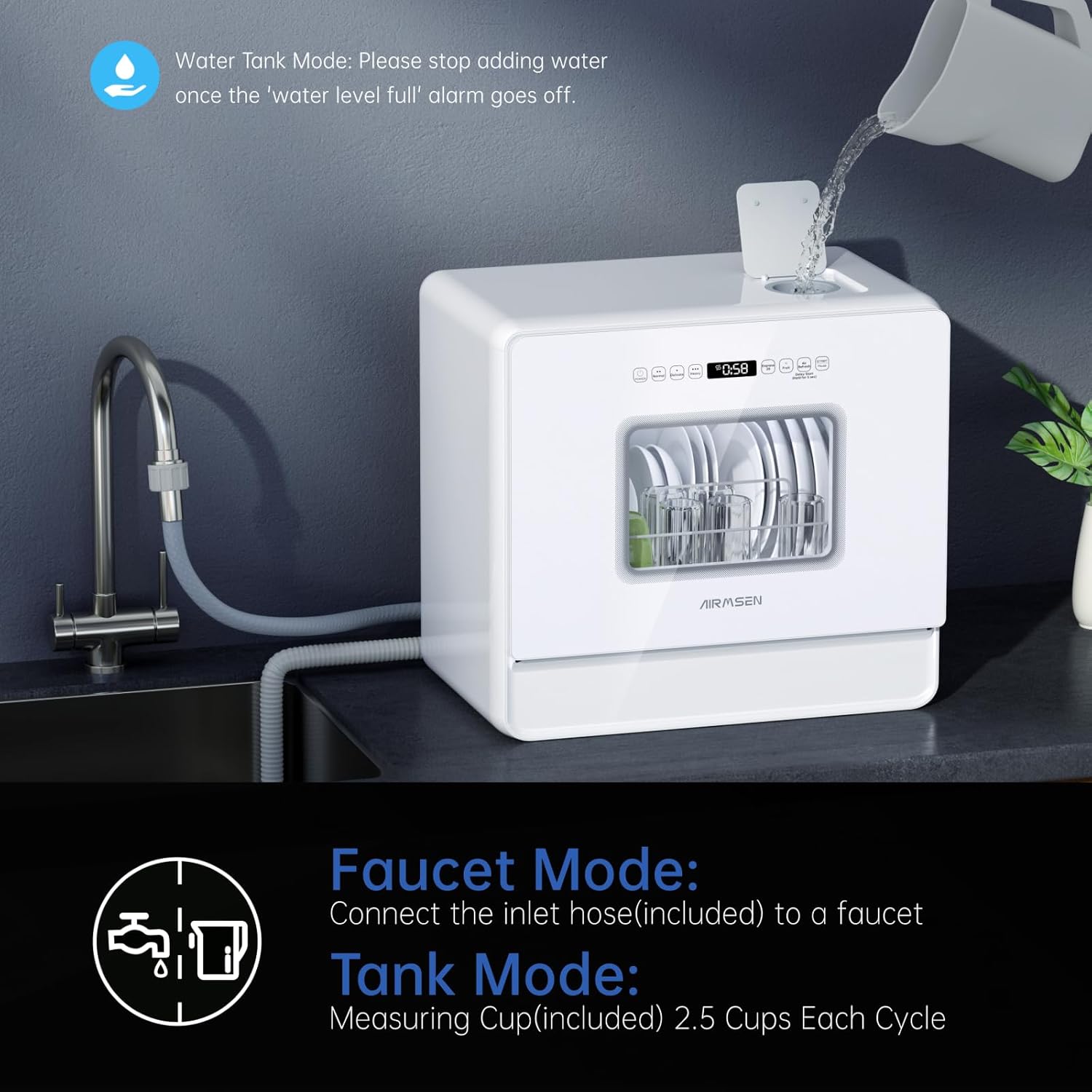 AIRMSEN Countertop Dishwasher Complete 2-Level Rack, Portable Dishwashers with 5L Built-in Water Tank, 3-Spray Arms & 12H Delay Start, No Hookup Needed, A01, White