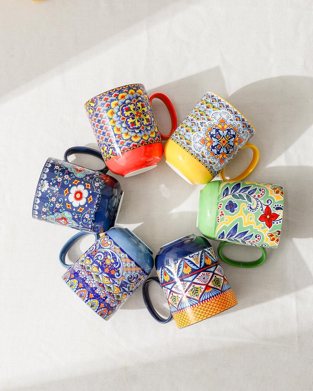- CAPTIVATING CRAFTSMANSHIP - Using intricate in-glaze decoration techniques and a triple firing process, these mugs flawlessly capture design intricacies. This dedicated approach results in visually captivating, durable mugs of exceptional quality. With brilliant colors and charming geometric patterns, each cup transforms every beverage moment into a festive occasion while enhancing the aesthetic appeal of your table and kitchen, creating an inviting atmosphere for stylish sipping.