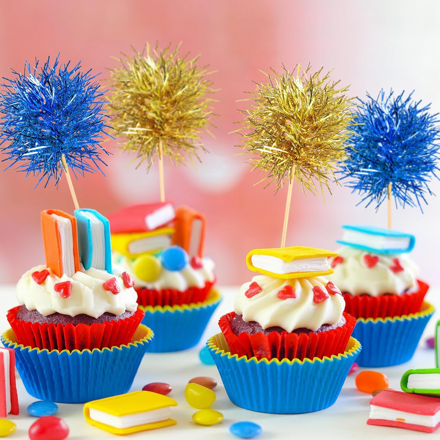 Chinco 100 Pcs Foil Firework Cupcake Toppers Sparkle Tinsel Cake Toppers Cake Decoration Cocktail Fruit Toothpick for Birthday Wedding Graduation Party(Blue, Gold)