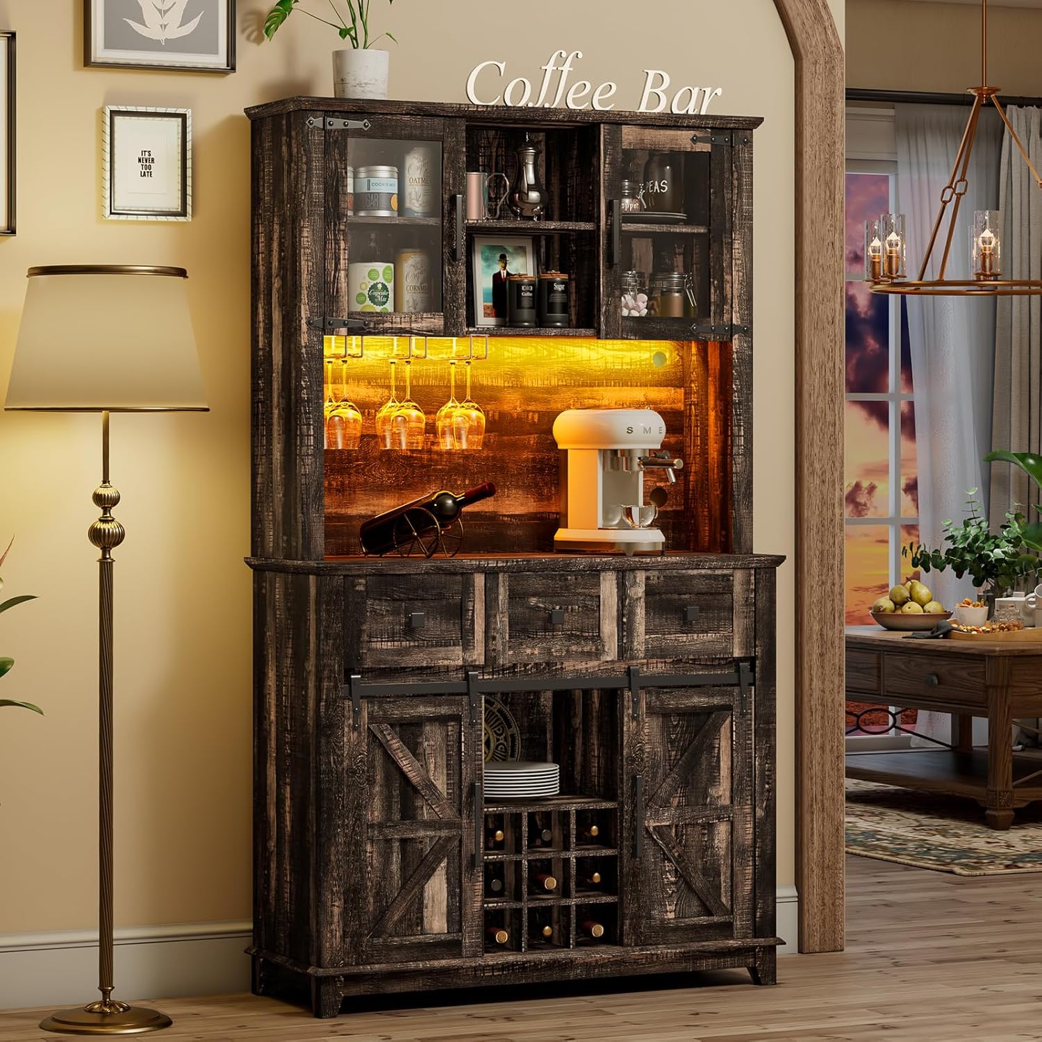 - [Double LED Strips] The coffee bar cabinet with double LED strips for 6 brightness, breathing, and instant night modes creates a home charming. With the gradient in the atmosphere, lighting illuminates the hanging glasses and tableware.