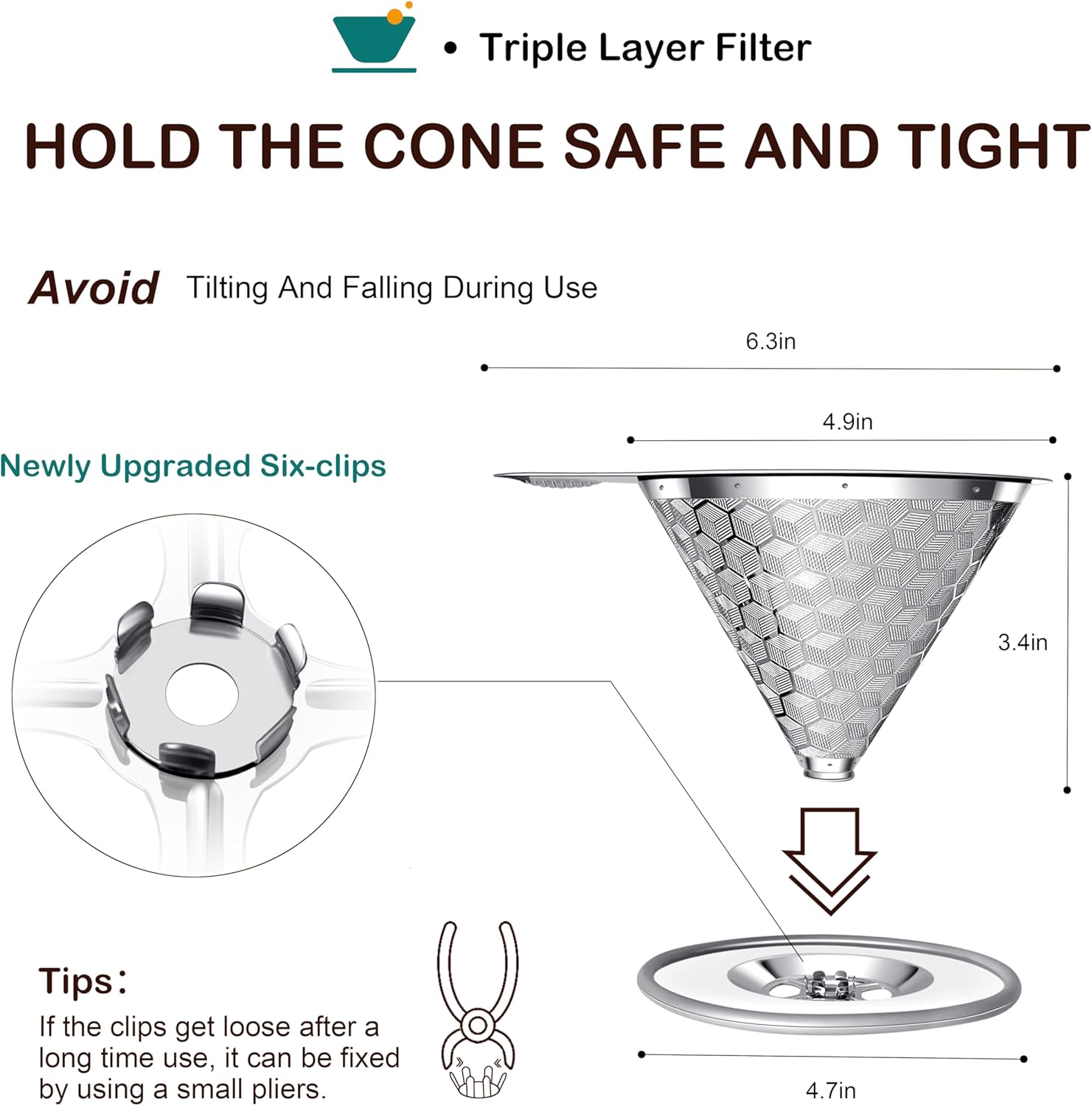 - 【High Quality Material】This Triple Layer Pour Over Coffee Dripper is crafted with heavy-duty, food-grade stainless steel 18-10 material, which is durable and long-lasting. The triple-layer structure solves the fragility issues commonly found in single-layer and double-layer coffee drippers on the market. It incorporates an innovative and advanced technique in Pour Over Coffee Dripper design. You can observe the beveled cuts in different directions on the cone, a feature that enhances efficient filtering and ensures high durability.