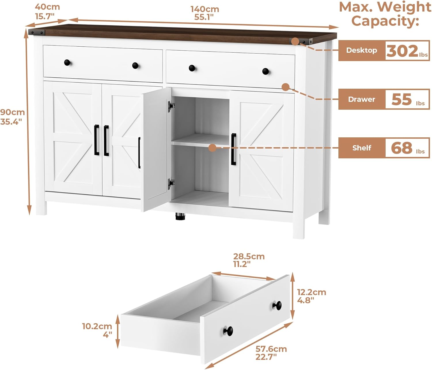- Special Feature : 2 Large Drawers, 4 Farmhouse Doors, 4 Adjustable shelves