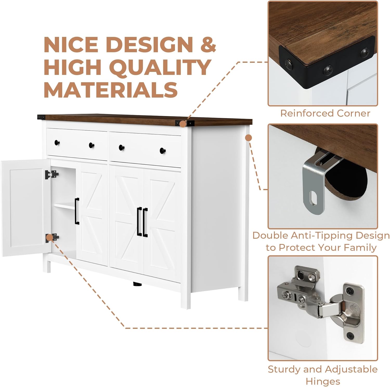 55" Sideboard Buffet Cabinet with Storage, Coffee Bar Cabinet with 2 Drawers and 4 Barn Doors, Long Storage Cabinet Modern Farmhouse, White Wood, for Kitchen, Dining Room, Living Room