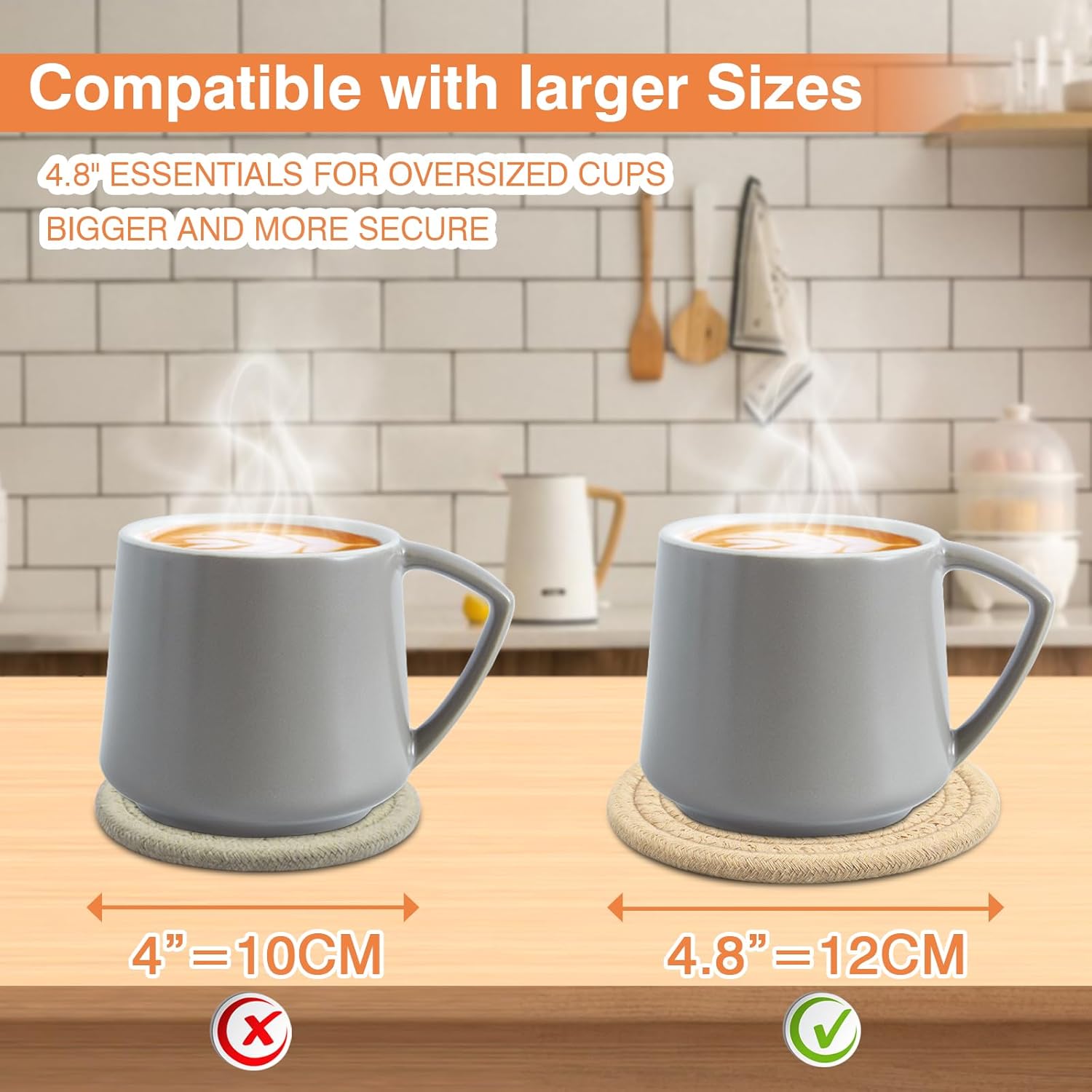 - 1. 【Bigger & Safer | 4.8in Cotton Coasters for All Cups】 Unlike regular 4-inch coasters, our 4.8-inch size offers more surface coverage — perfect for oversized mugs, glass tumblers, or even mini plant pots. Designed for those who enjoy coffee tables free from scratches, spills, and heat marks