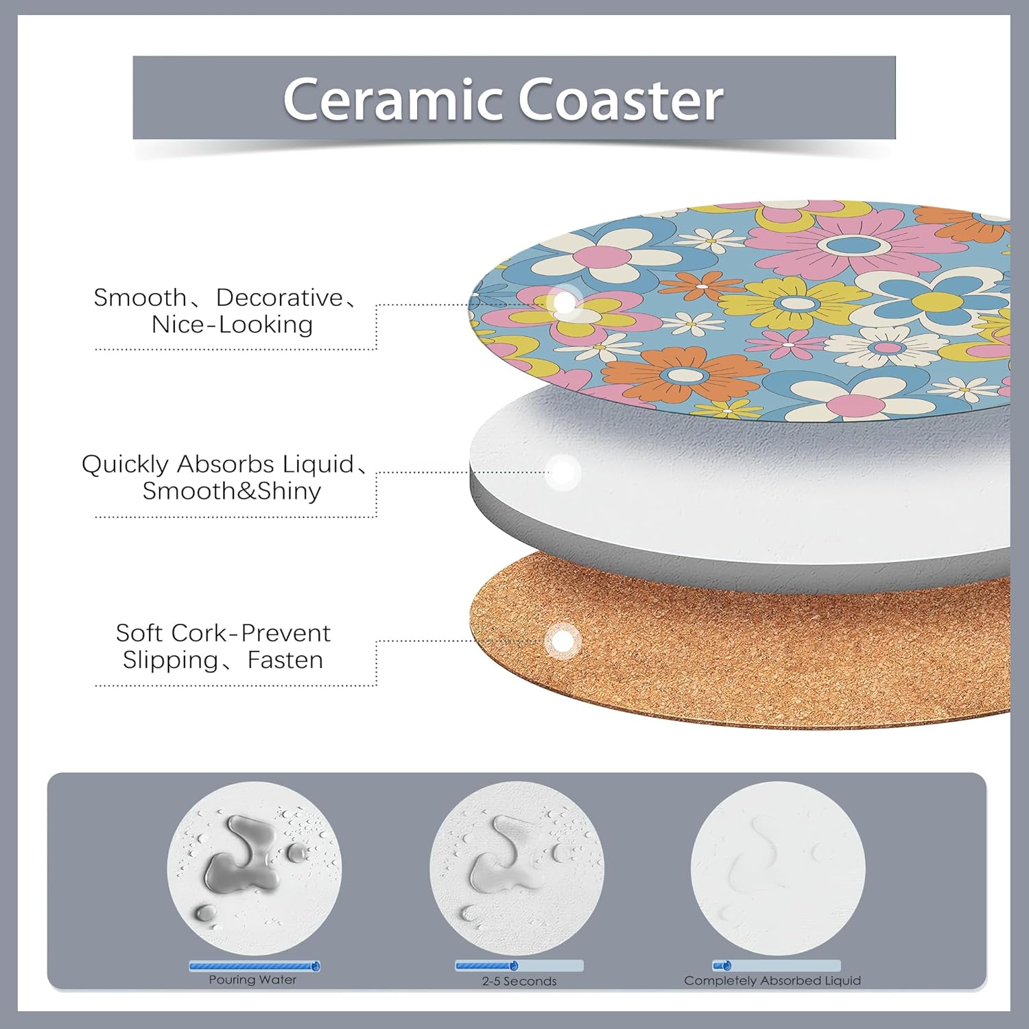 - 【Water-absorbing Ceramics】These coasters are super water-absorbent, the cork back can avoid scratching your furniture and prevent coasters falling off the table.