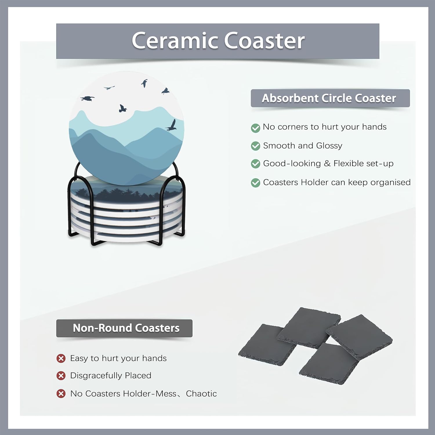 - 【Coaster with Metal Holder Set】The set includes 6 round ceramic coasters and metal coaster holder.