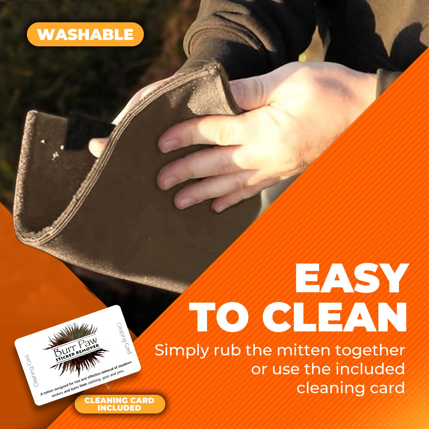 - EASY TO MAINTAIN - After rubbing the affected area, use the cleaning card included to scrape larger stickers off the mitten. Reusable in the field or at home to keep gear, pets, and clothing clean.