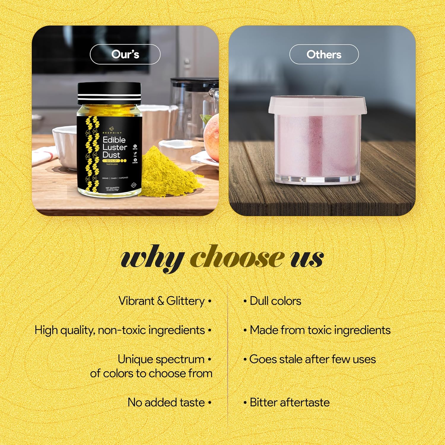BeePoint Gold Edible Luster Dust 15g - Food Grade, Vibrant Color Shimmer Powdered Dust for Drinks, Cocktails, Cake Decorating, Baking, Chocolates, Candy, Sweets, & Cookies - Vegan & Gluten Free