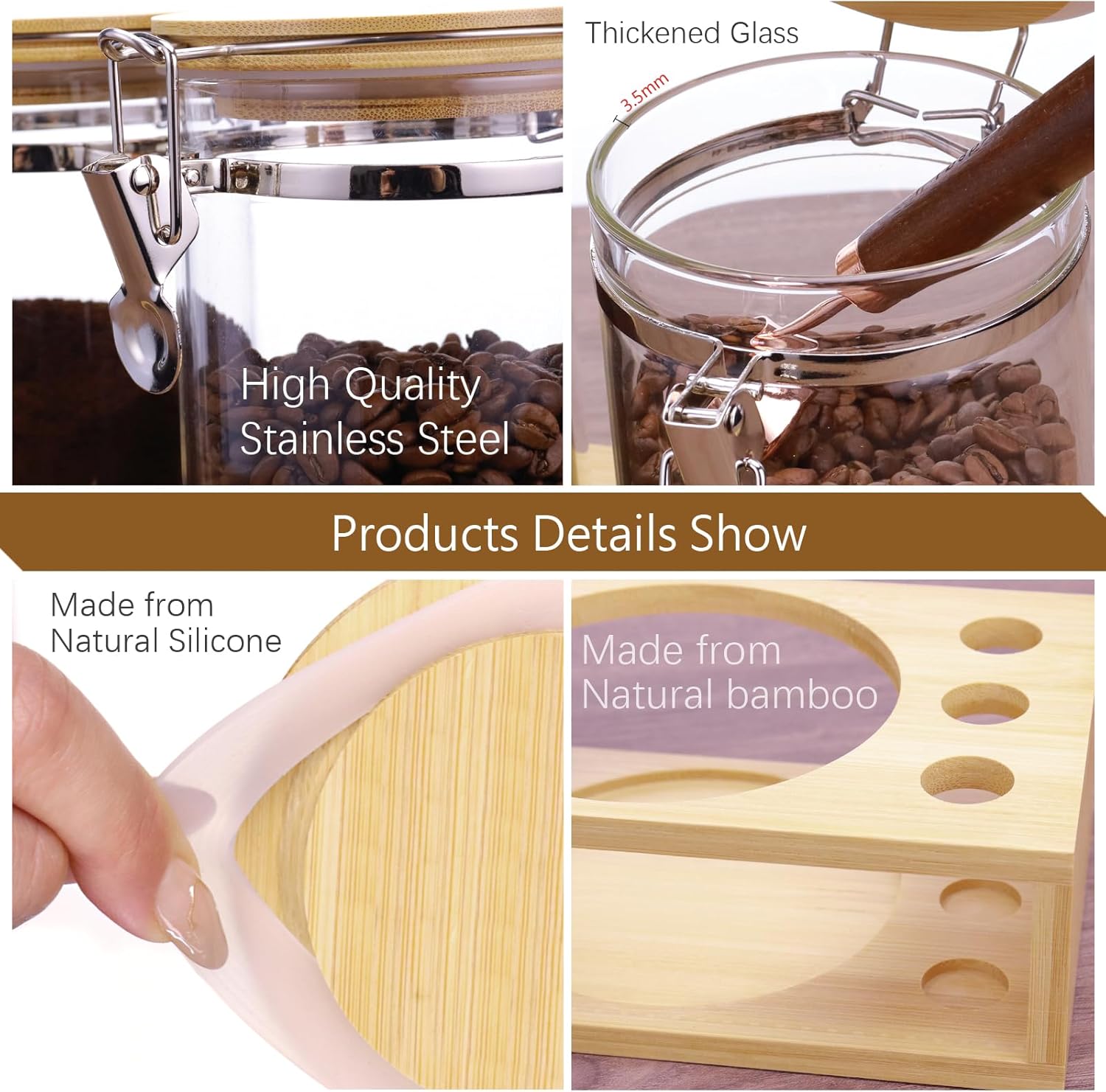 - 【High Quality Design】 The coffee containers set is made from real high-grade borosilicate glass, Make sure it is still bright after long time using. 3.5mm thickened glass design, exquisite stainless steel buckle, fine workmanship, making the jar more textured.
