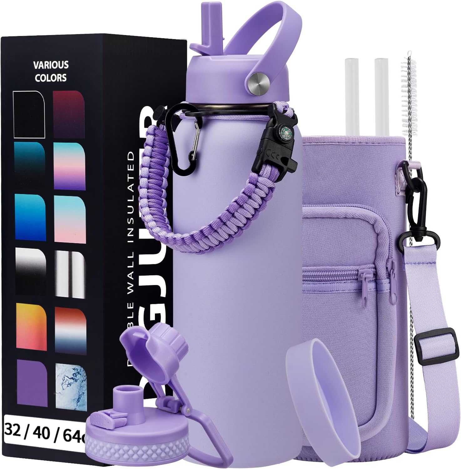 - COMBO—Super Deal: Buy 40oz stainless steel water bottles and get 9 accessories (2 x lids, 1 x survival paracord, 1 x carrying pouch, 1 x shoulder strap, 1 x protective cup mat, 2 x straws, 1 x straw brush). WITH A LIFETIME GUARANTEE, these thermal water bottles are the perfect gift for use at home, work, school, road trips, hiking, sporting events, or just hanging out