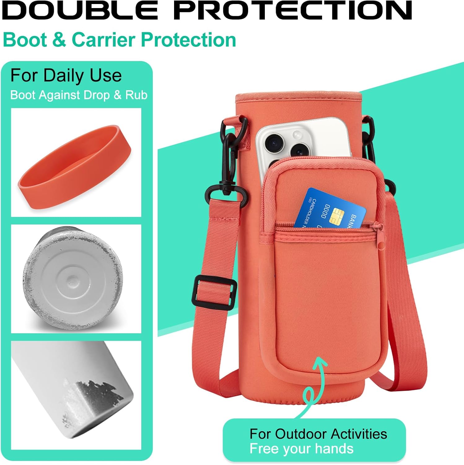 - PROTECTIVE BOOTS & STORAGE CARRIER BAG: Upgraded silicone boots prevent shattering and cracking when stainless steel water bottle accidental dropped. The storage carrying pouch made with neoprene material provide extra protect & insulation for your travel water bottle, 2 zippered pockets design to stores cards, keys and phones of any size.