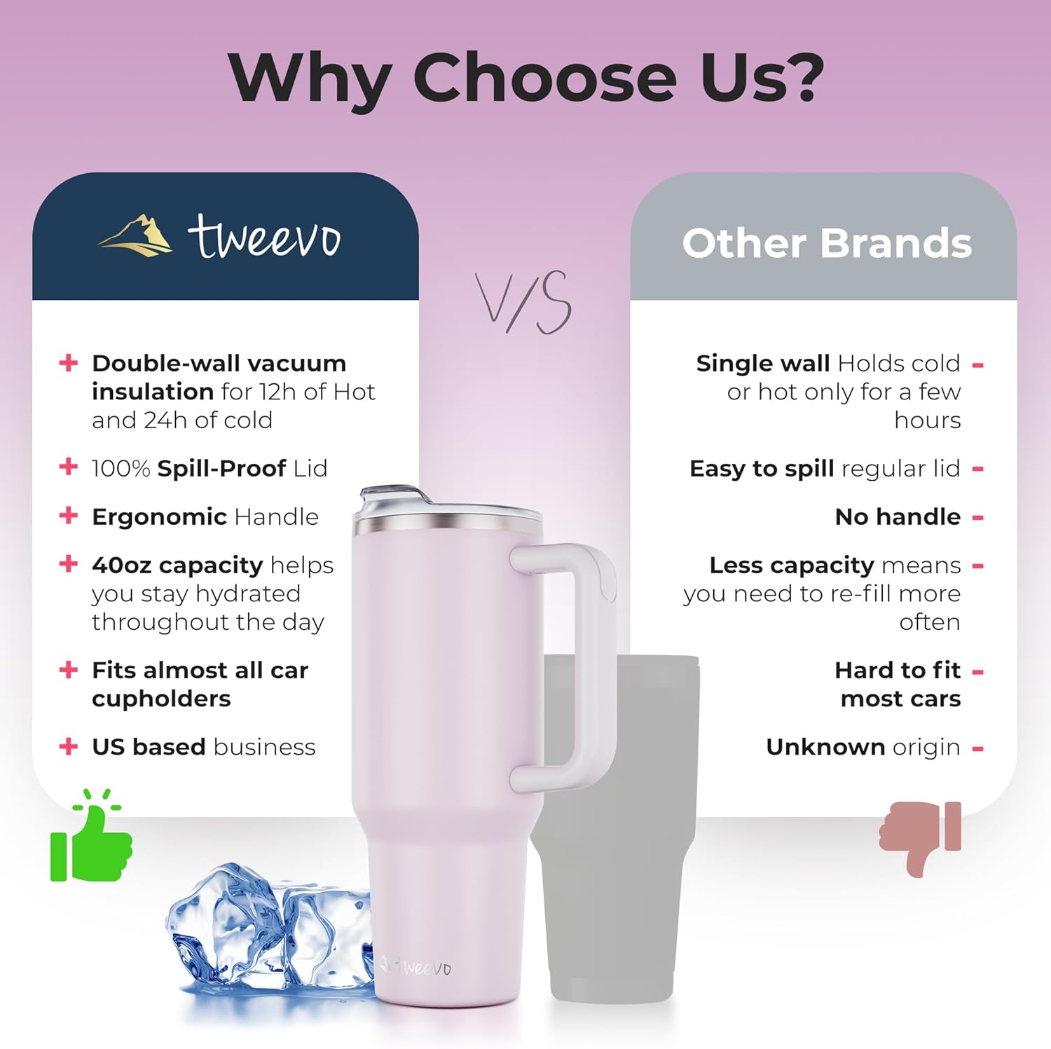 - Versatile insulated tumblers: With a large 40 oz capacity, this insulated tumbler is perfect for staying hydrated throughout the day. Whether you prefer iced drinks on a hot summer day or hot beverages during chilly mornings, this tumbler maintains your drink's temperature for hours.