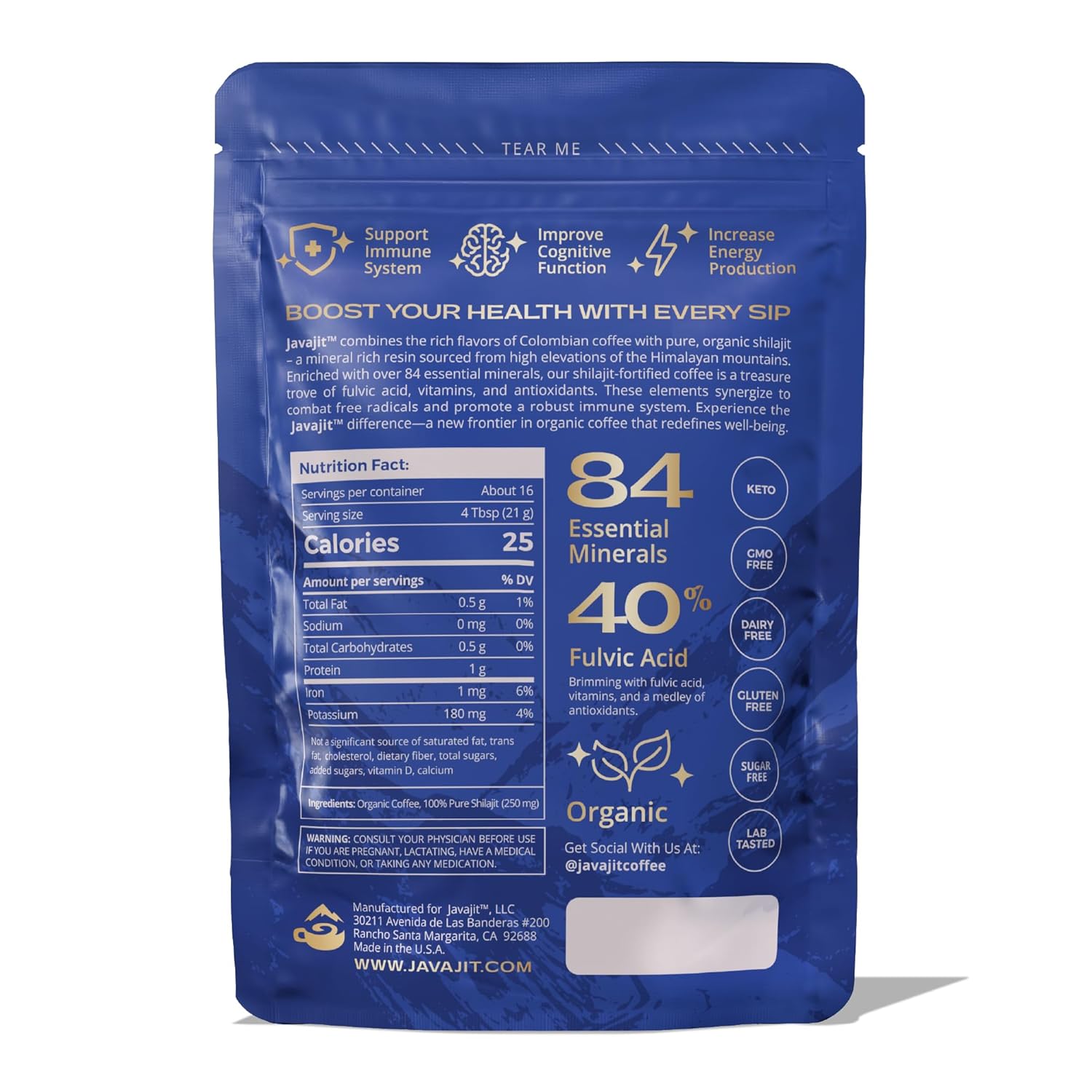 - 100% PURE SHILAJIT: A natural substance formed over centuries by the gradual decomposition of certain plants, shilajit is a potent and very safe dietary supplement that contains 84+ trace minerals and fulvic acid. There are 250 mg of shilajit per serving of Javajit (4 tbsp).