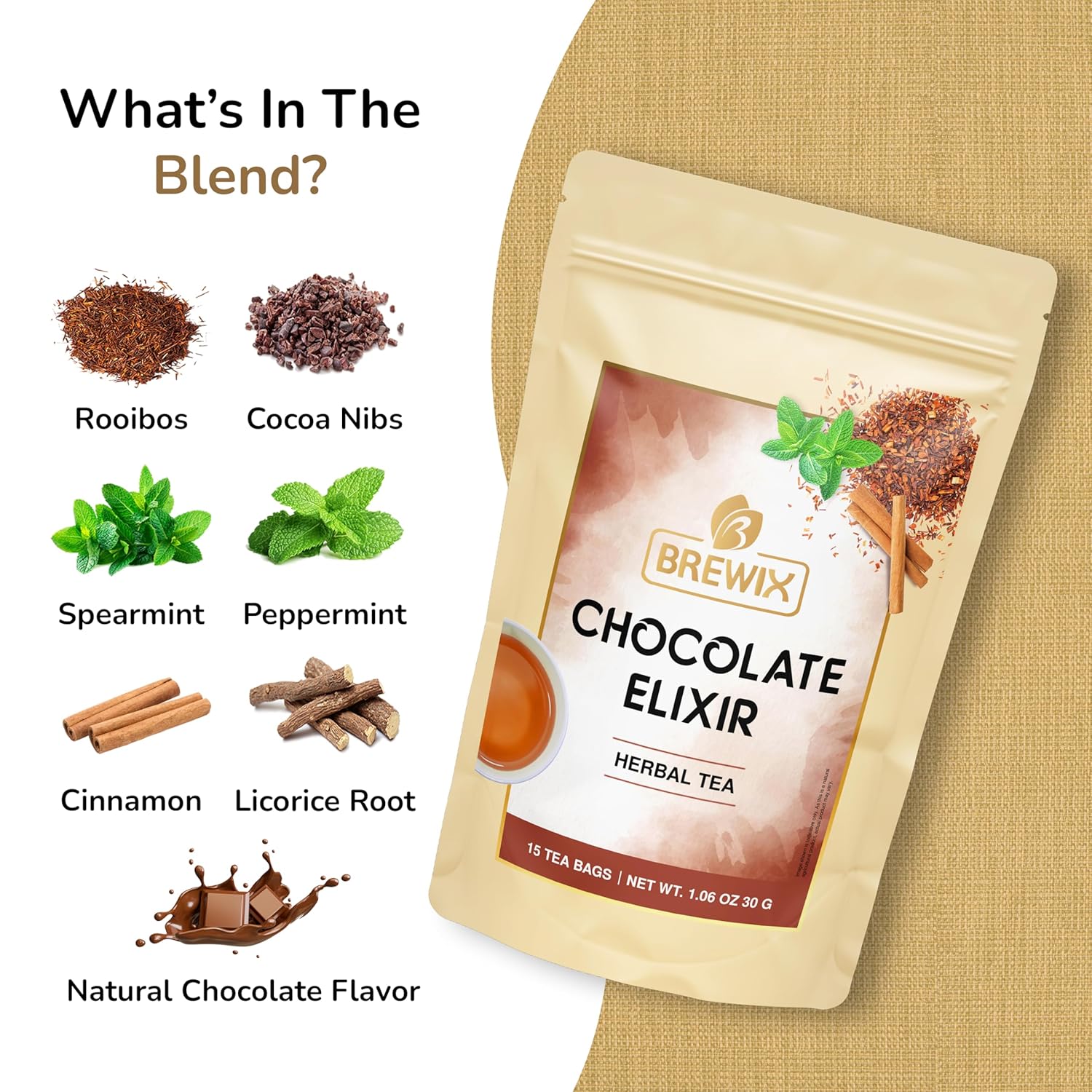 BREWIX, Chocolate Rooibos Herbal Tea Bags, (15 Pyramid Tea Bags) | Red Tea with Cocoa | Rooibos, Cinnamon, Spearmint, Peppermint Tea | Naturally Caffeine-Free