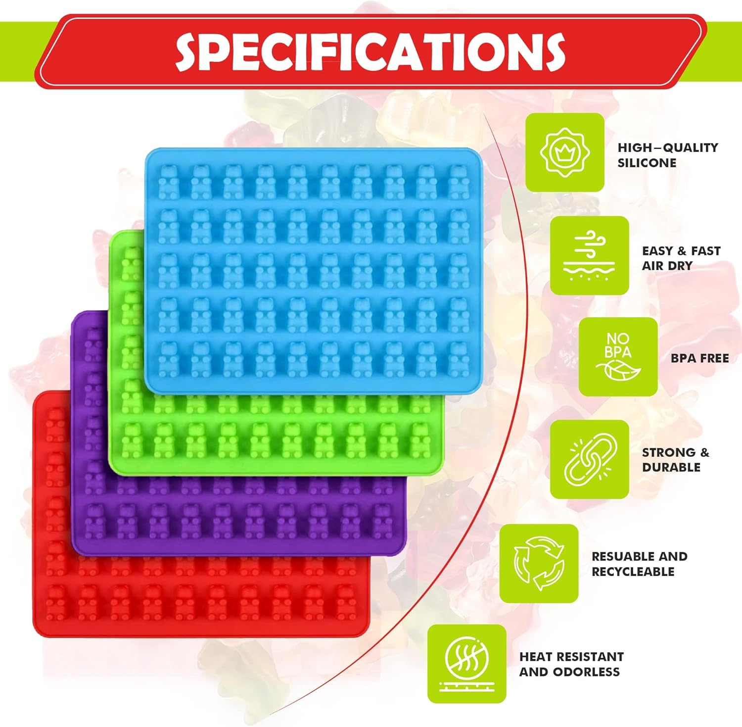 - Make adorable gummy bears at home with this set of 4 silicone candy molds and dropper! The molds are made of high-quality, food-grade silicone that is safe for making candy and other treats.