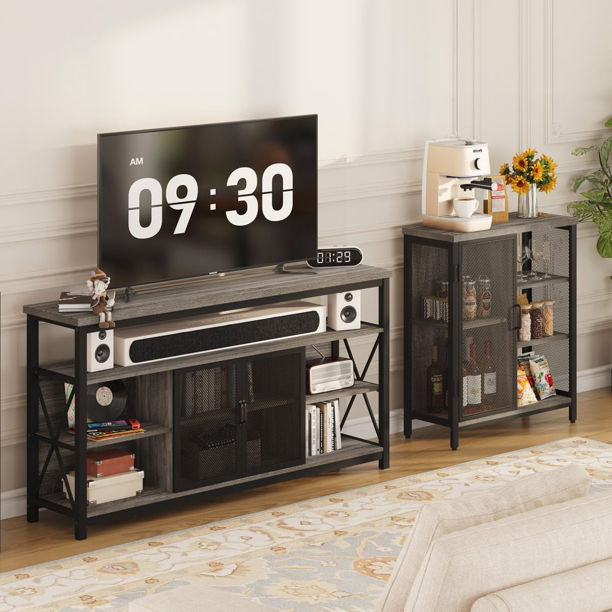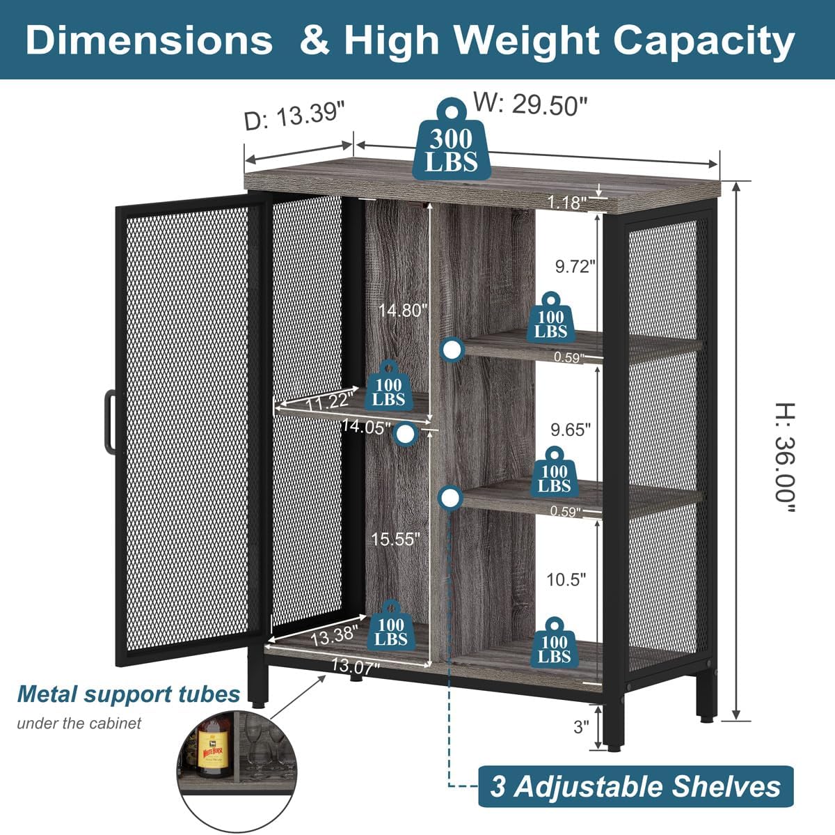 - NOT WOBBLES AT ALL: Thanks to heavy duty metal frame and extra support leg under bottom shelf, this accent cabinet stands quit stable. We also provide anti-tip device, you can mount it to the wall to avoid unexpected tipping. 4pcs pre-assembled plastic pad avoids your wood floor from scratching.