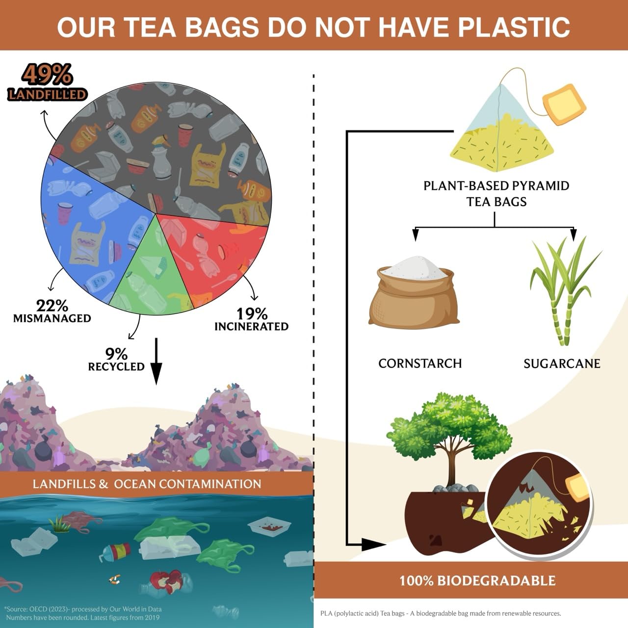 - CONVENIENTLY PACKED - The tea comes packed in pyramid bags that allow for a more fuller and intense brew as it provides ample space for the tea leaves to unfurl and infuse. We have removed individual sachets from our packaging to reduce wastage, instead the pyramid bags are packed inside a resealable pouch that can be conveniently stored or carried as a travel tea. Each black assam tea bag contains 2gms of tea.