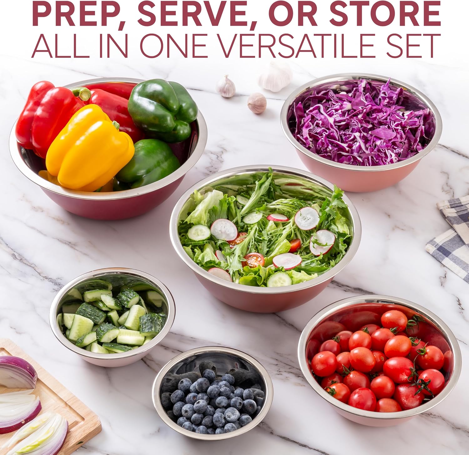 - 6 Piece Stainless Steel Nesting Bowls Set includes 6 Prep Bowl and Mixing Bowls - a practical set of easy to clean kitchen bowls that can be used for food prep, serving and storing.