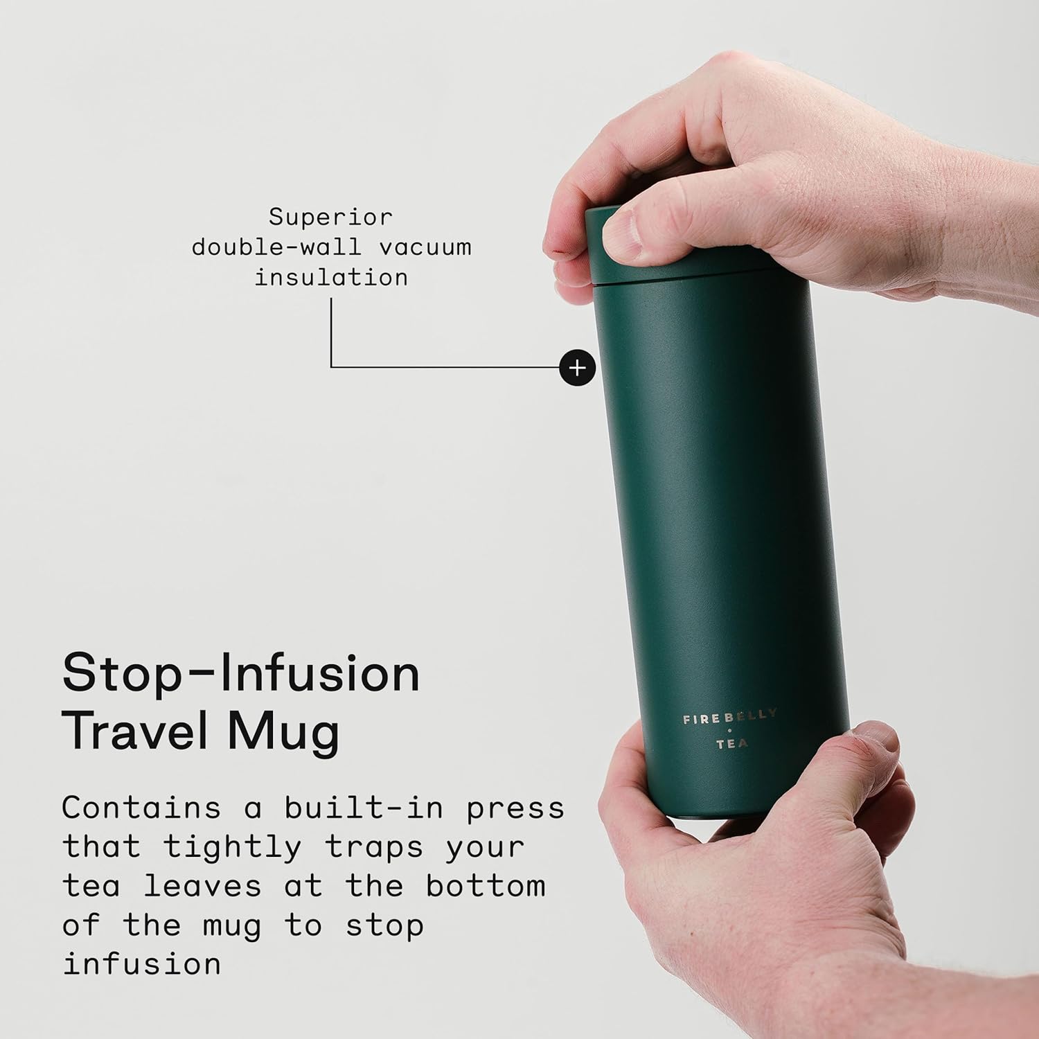 Firebelly Tea, Travel Tea Infuser Mug with Strainer, Insulated Tumbler for Loose Leaf Tea or Coffee, Leakproof Bottle for Hot or Iced Drinks, Stainless Steel Thermos with Lid, Forest