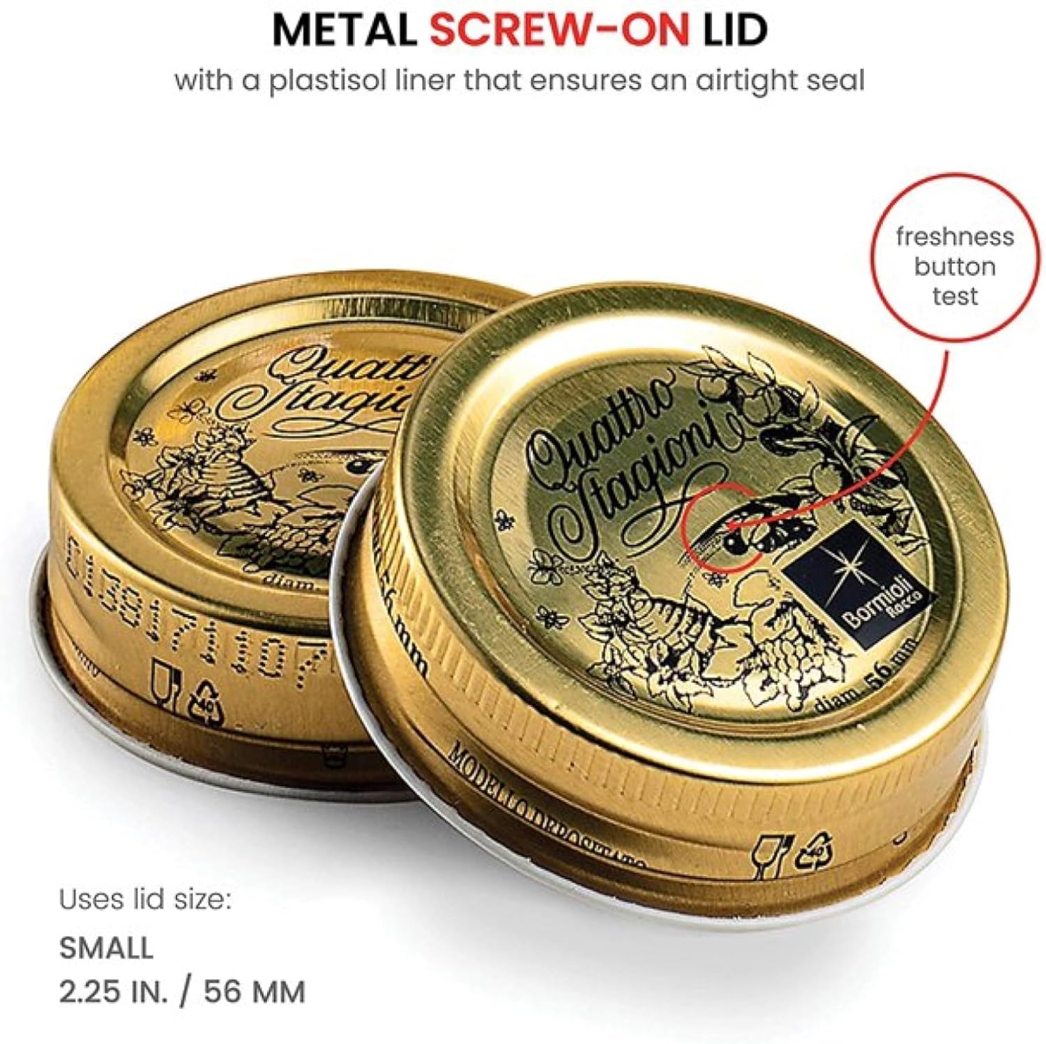 Bormioli Rocco Quattro Stagioni Small Bottles, Set of 6-6.75 Oz. Embossed Reusable Glass Jars with Airtight Lid, For Food Prep, Sauces, Gifts & Crafts - Round Bottle Containers, Made in Italy