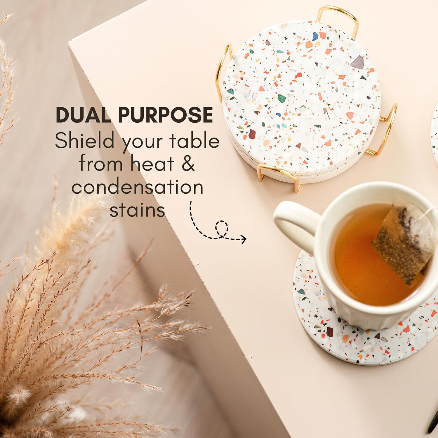 - Minimalism & Elegance: This coasters with holder comes with a gold metal holder for easy storage and 6 marble drink coaster to suit all centerpiece table decor. Our water absorbing coasters are available in green, black, navy blue, white coasters.