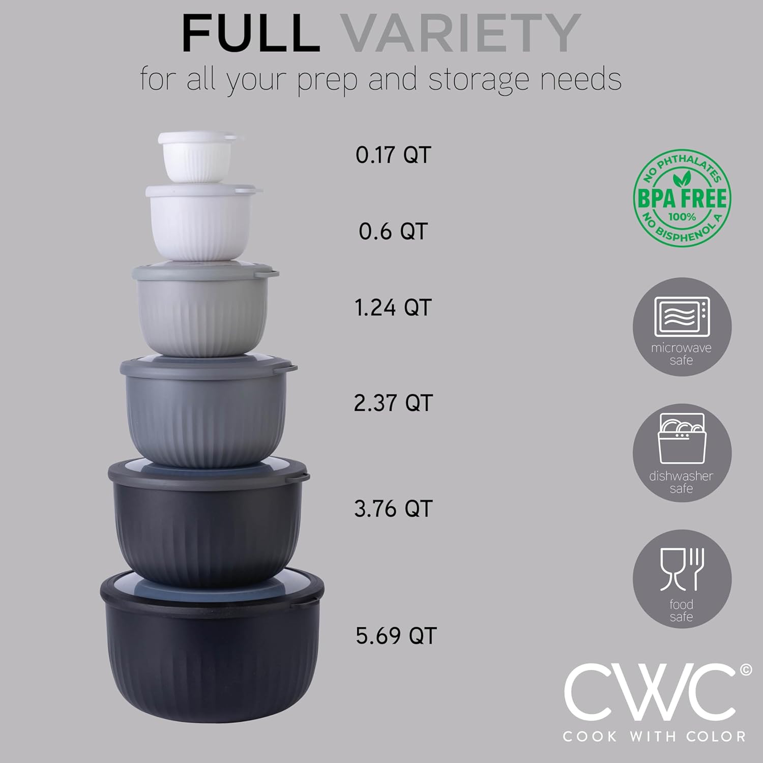 - Set Includes the great combination of small and medium size bowls: The sizes of our bowls are: .17 qt, .6 qt, 1.24 qt, 2.37 qt, 3.76 qt, 5.69 qt bowls with lids. A size for all your kitchen needs.