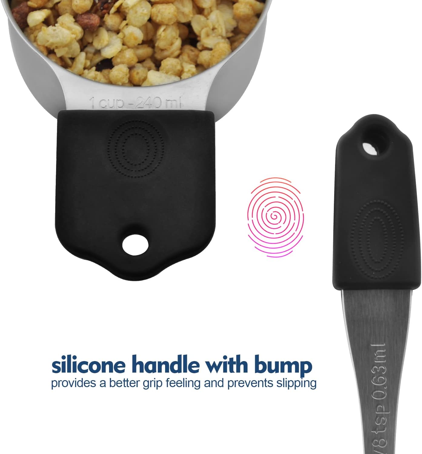 - BPA Free Colored Silicone with Superior Craftsmanship - You shall fall in love with the colored silicone handles with engraved marking, easy to recognize the one you want. The slight thumb indentations fit your fingers well and offer a better grip even when your hands are wet and slippery. It makes scooping and gripping easy. The rainbow color makes it fun for kids.