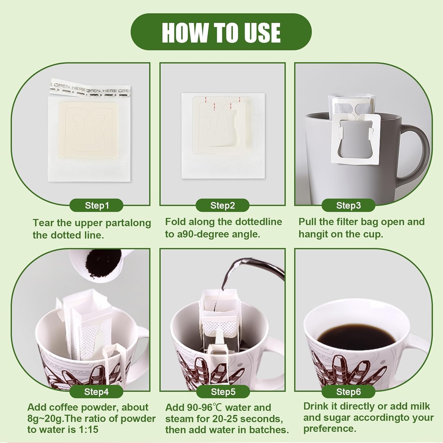 - EASY AND QUICK BREWING - Each hanging ear drip coffee bag allows you to brew a delicious cup coffee in less than a minute. Simply add your preferred 8~20g coffee grounds to the drip coffee ear filter paper,pour in 194-205℉(90-96℃) hot water into the single serve coffee filters and get the right ratio of coffee to water down and make sure to bloom the grounds and you can brew the perfect coffee —no sediment or grinds will be left behind