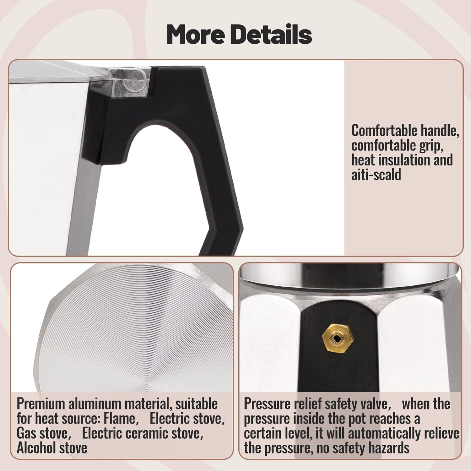 - Exquisite Taste Experience: Elevate your coffee moments with our Moka pot. It's not just about the incredible taste of your cup of coffee; it's about the whole experience. Unleash your creativity and prepare personalized, smooth, and rich brews for your loved ones, evoking elegance and style, regardless of the occasion or setting