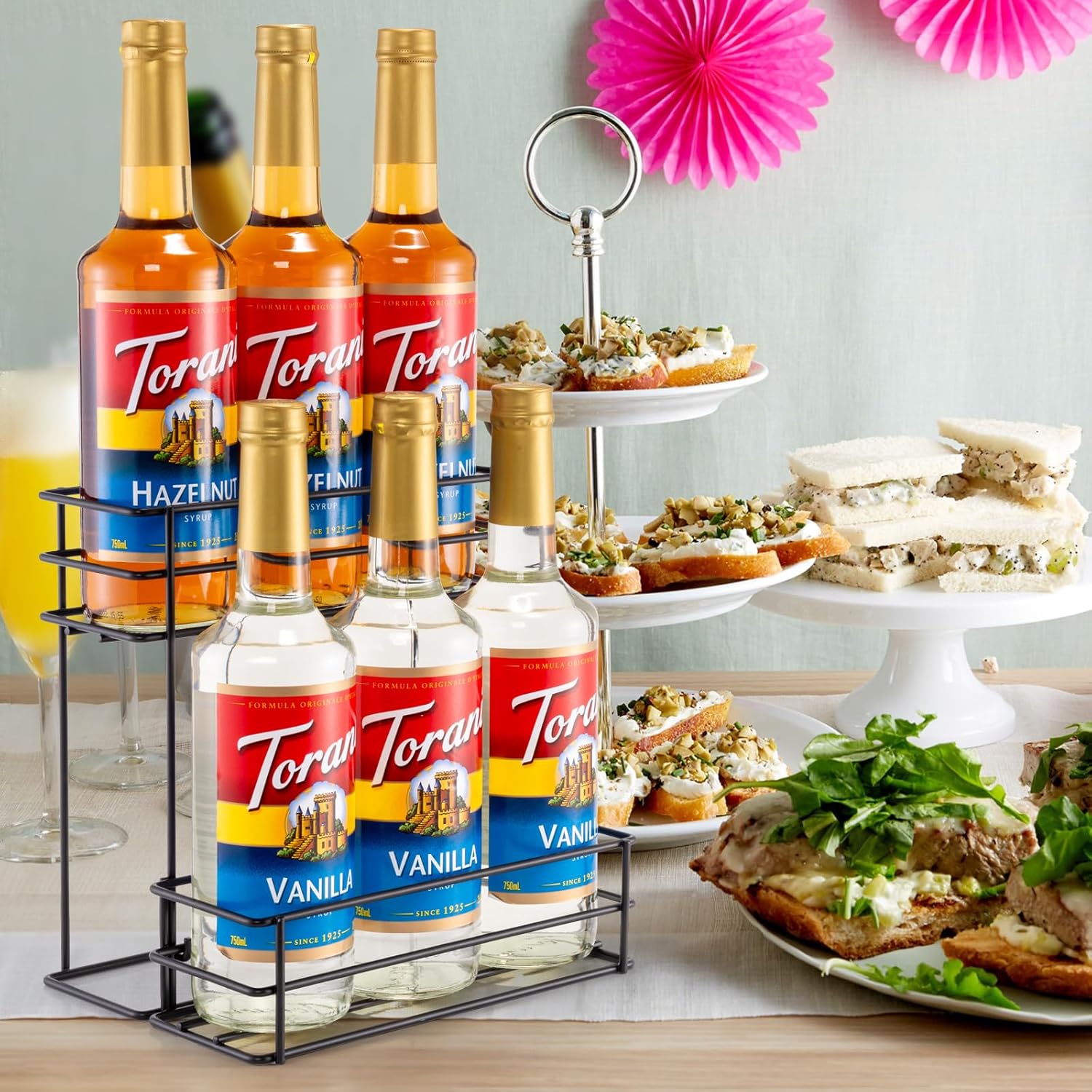 - ·ăCoffee Bottle StandăâDo you have many flavored coffee syrups? Are you tired of rummaging through coffee bar cabinet for coffee syrup bottles? Our 6 bottles coffee syrup rack for coffee bar decor is the perfect solution for organizing and displaying your coffee syrups. .Its dimensions of 9.9''L x 7.3''W x 9.9''H and each tier approximately 3.7" wide.Features a stepped design to keep the items on the shelf at a glance and saves space.