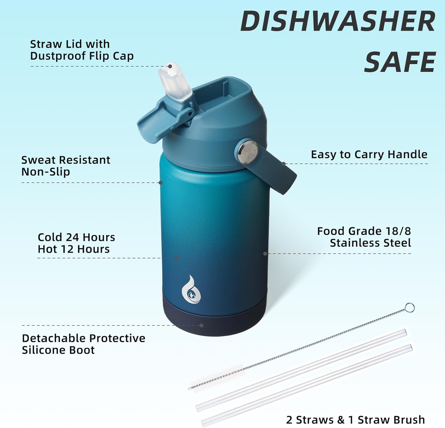 BJPKPK Insulated Water Bottle with Straw Lid, 12oz Thermos Water Bottles with Soft Nozzle, Flex Handle & Non-slip Boot, BPA Free Leak Proof Stainless Steel Metal Thermos, Tumblers, Cups,Vast