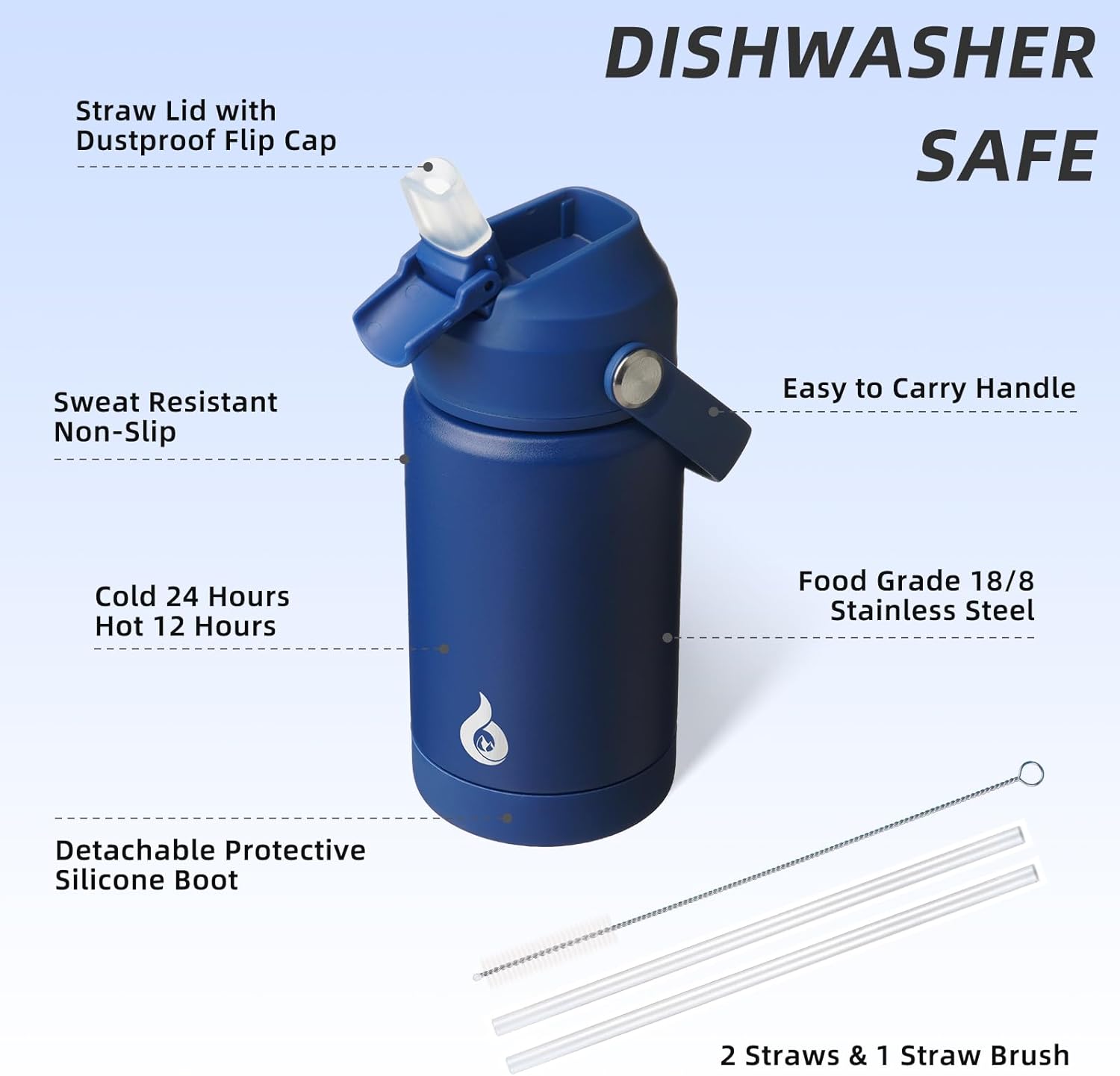 - NON-SLIP PROTECTIVE BOOT & DISHWASHER SAFE: This stainless steel water bottle comes with a detachable silicone boot to protect the bottom from bump damage. The wide mouth design of our water cup allows for easy filling, pouring, and cleaning. With 2 straws and 1 straw brush, you can easily clean the nozzle and straw with straw brush. It is also dishwasher safe, saving you time and effort in maintaining its cleanliness and hygiene