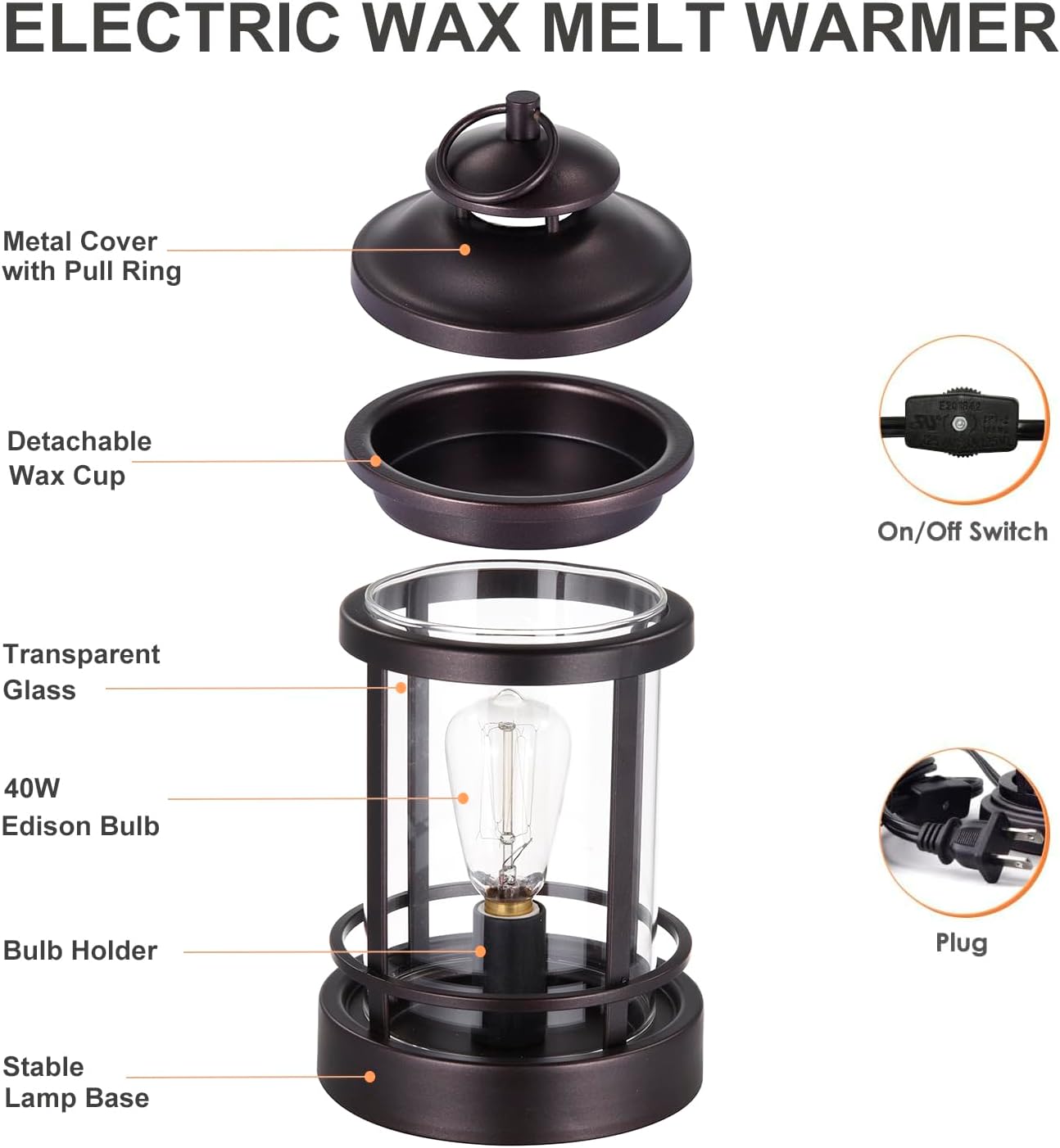- 1.【Industrial Farmhouse Wax Melt Warmer】 Crafted with heat-resistant iron alloy, this wax melt warmer seamlessly blends Edison bulb aesthetics with farmhouse wax melt warmer charm. The clear glass dome (doubling as a wax warmer with lid) showcases a retro filament glow, while the painted metal base ensures durability. Perfect for industrial home decor, it merges rugged design with rustic versatility, ideal for wax warmer enthusiasts seeking style and function.