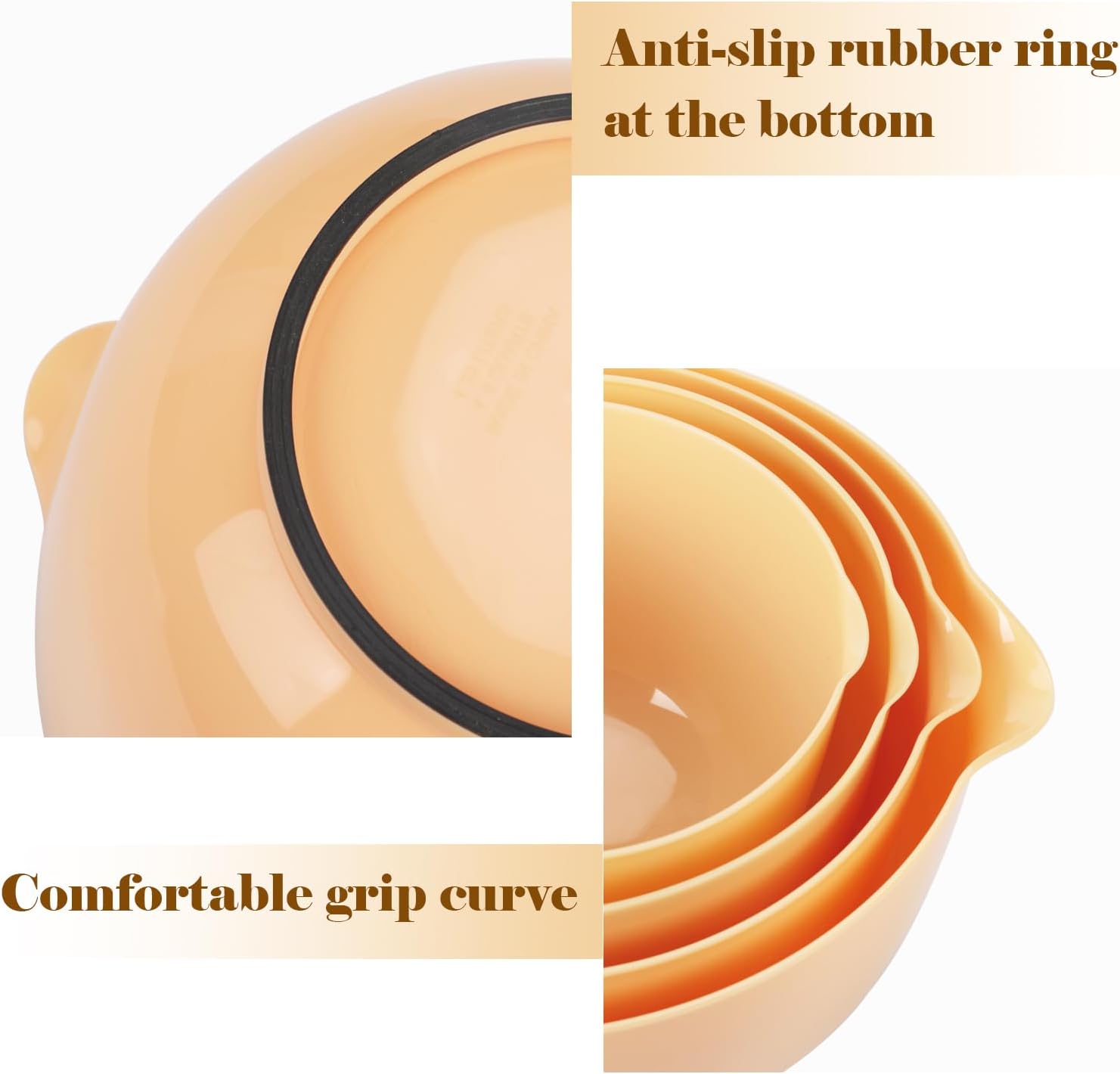 - 【Stackable Design & Space-Saving】4 piece nesting mixing bowls enhance ample capacity, sets includes 1.7qt bowl, 2.5qt bowl, 3.5qt bowl and 4.5qt bowl. This mixing bowl set with pour spout is tailored to meet your various needs from mixing to serving meal. And nesting design saves extra space to store more kitchen utensils or cookware.