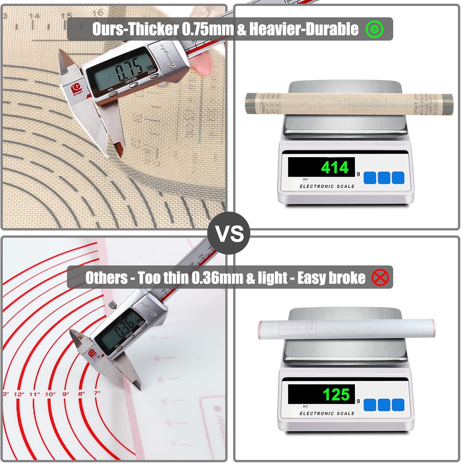 - 【Double Thickness & Extra Large】: Silicone baking mat is twice thickness(0.75mm) than the other dough mat (0.35mm) on the market. Our silicone pad will stay good on the table and not wrinkle when used. Ultra large size pastry mats(34X26 inch), which prevent the flour or fondant will be spilled on the table.