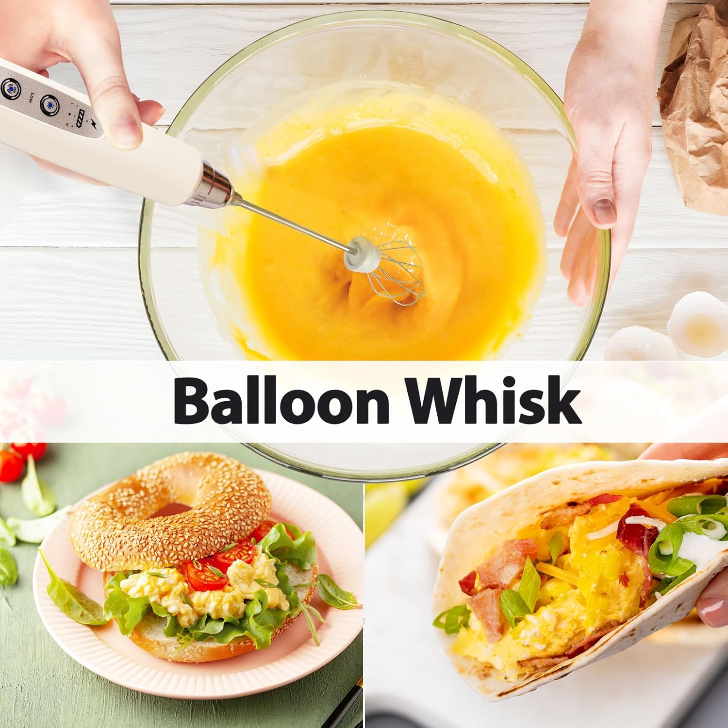 - 【3 Whisks, Use Anywhere You Need】: 3 interchangeable multifunctional whisks: Spring Whisk for milk and coffee froth for delicious drinks; Ball Whisk for whisking eggs and whipped cream; Hook Whisk for mixing powders, making jams.