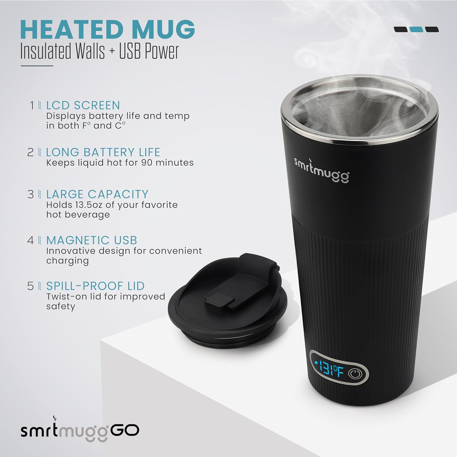 - ✅ Charging is a snap! Simply snap on the included magnetic charging cable and your SmrtMugg Go will begin charging.