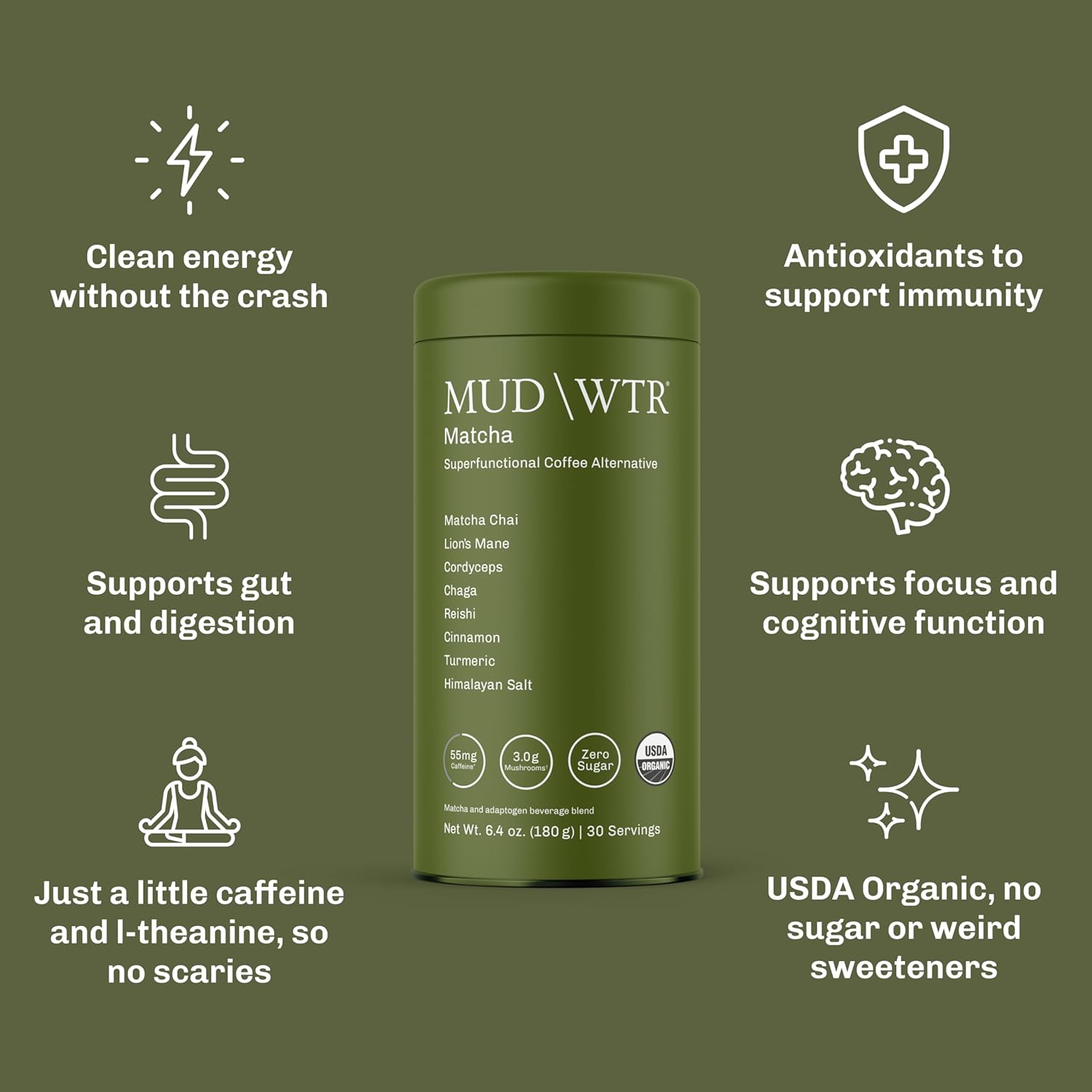 - WHAT DOES MUDWTR DO DIFFERENTLY - Functionality & benefits are prioritized over everything else with MUDWTR. With 3,000mg of USA grown beneficial mushrooms and 55mg of caffeine, a fraction of what is found in a cup of coffee, our USDA Organic matcha powder delivers laser focus without the brain fog. We all love a good cup of coffee, but without as much caffeine, this mushroom coffee alternative gives you more benefits, without jitters, crash or dependency