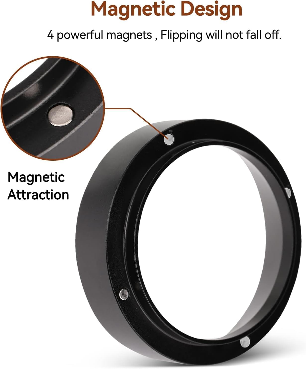 - Magnetic Dosage Ring: With evenly distributed magnets at the base of the espresso dosage funnel, providing a strong adhesive force. Allows quick and instant locking onto your portafilter, ensuring a simple and reliable coffee process
